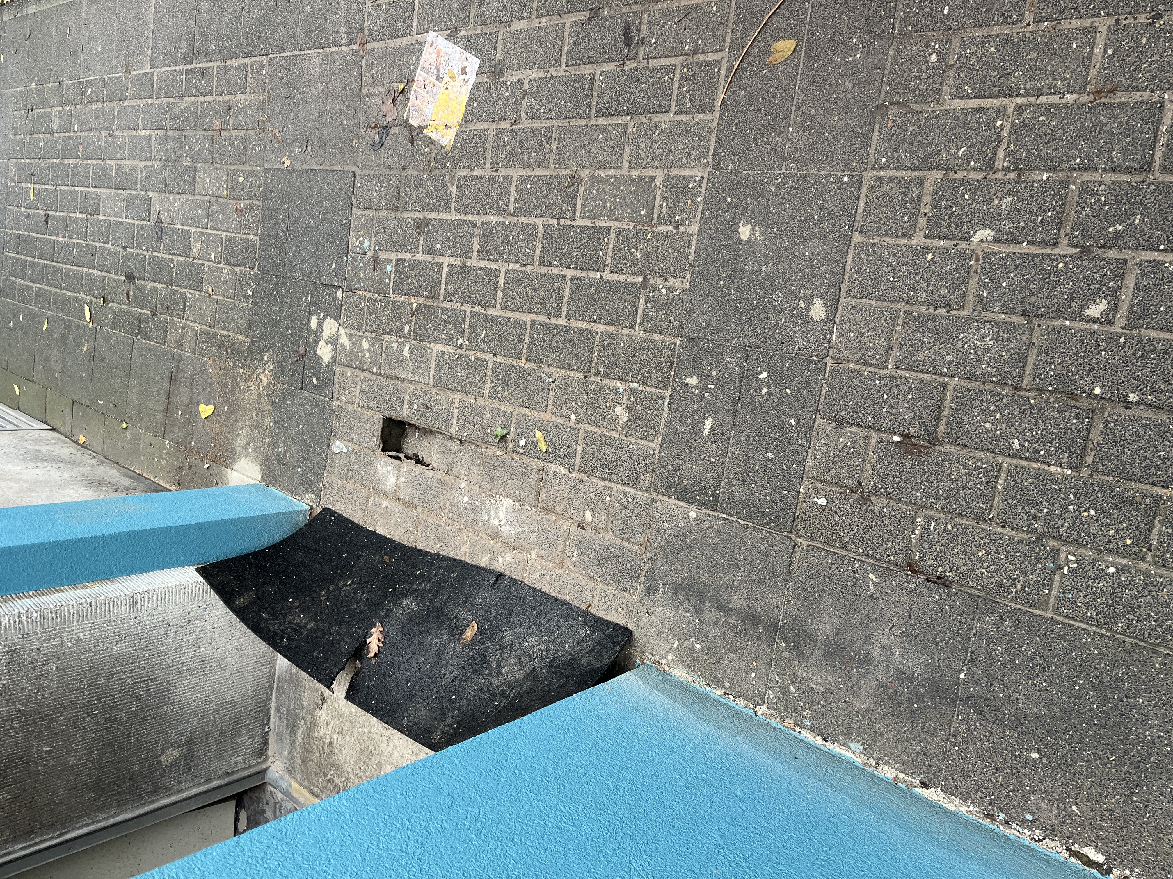 Seit heute ist einer der Pflastersteine abgesackt. Hier besteht eine erhebliche Gefahr für Passanten.