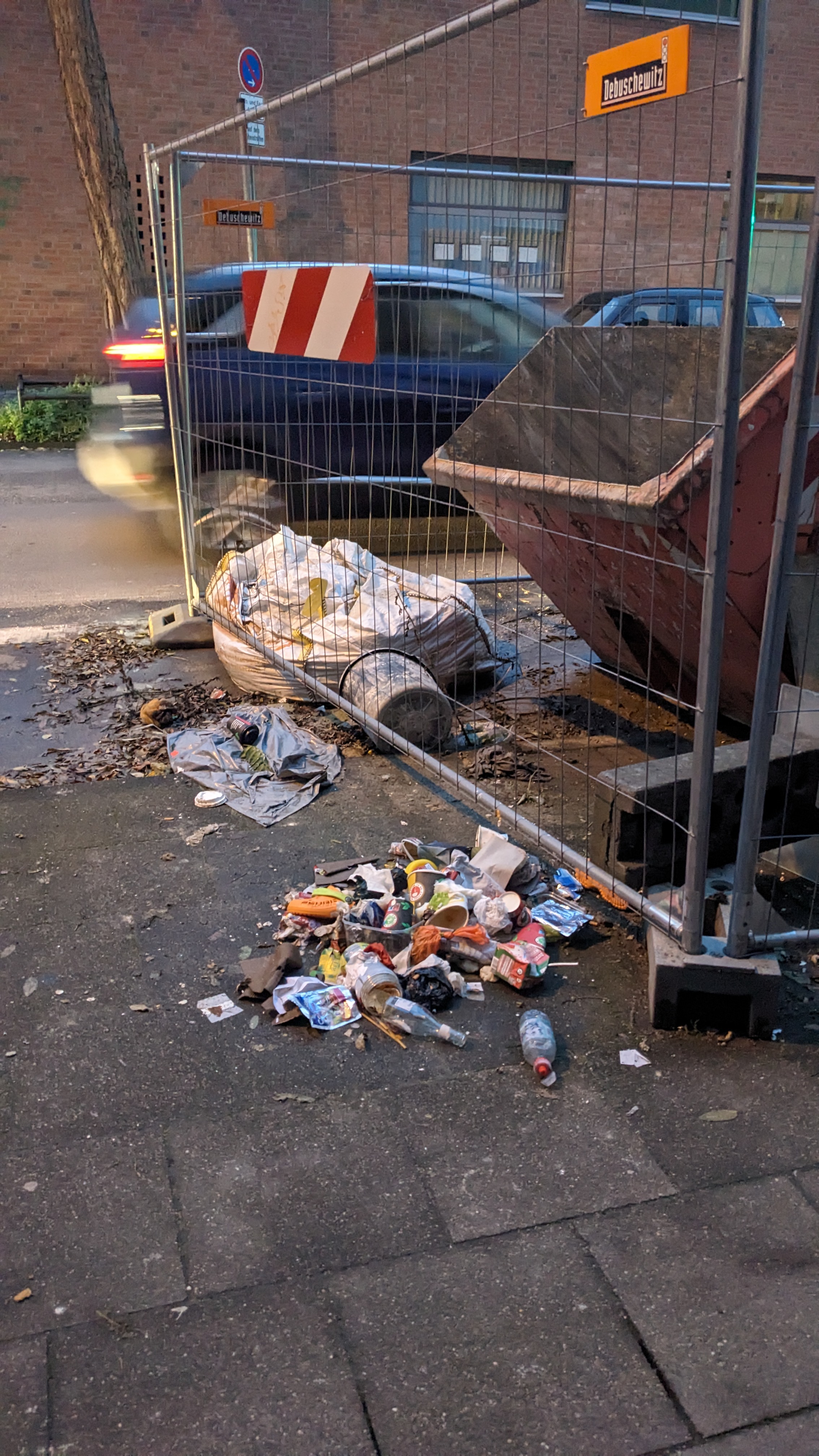 Hier liegt seit ein paar Tagen dieser Haufen Müll, lose vor der Tür. Kann leider nicht sagen ob eine Tonne bei der Leerung umgekippt ist oder es so mutwillig hin gekippt wurde.