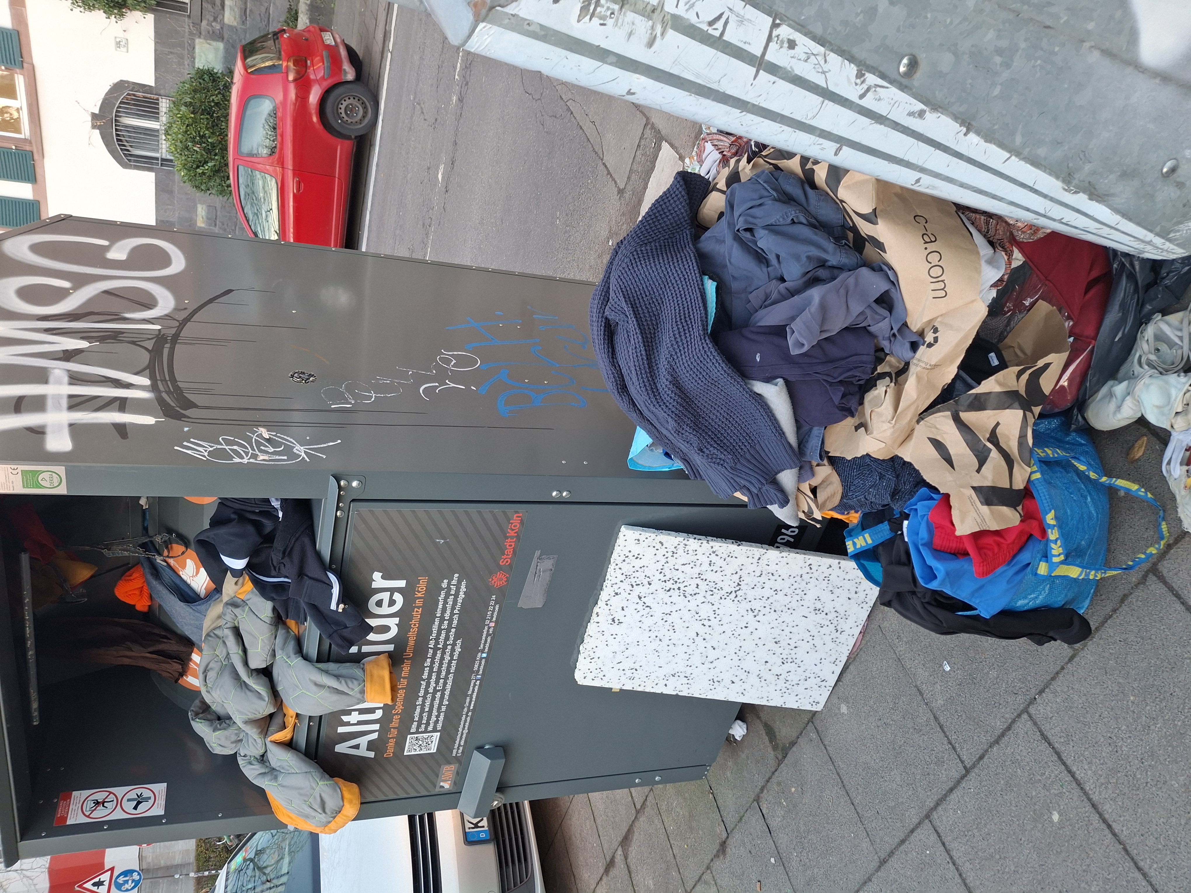 Altkleidercontainer läuft über- Blücherstr.15, Nippes. Neu Altkleidercontainer voll Blücherstr. 15 50733 Köln Deutschland Statusvermerke Das Anliegen wurde erstellt. Neu Do., 11.12.2025 - 15:23