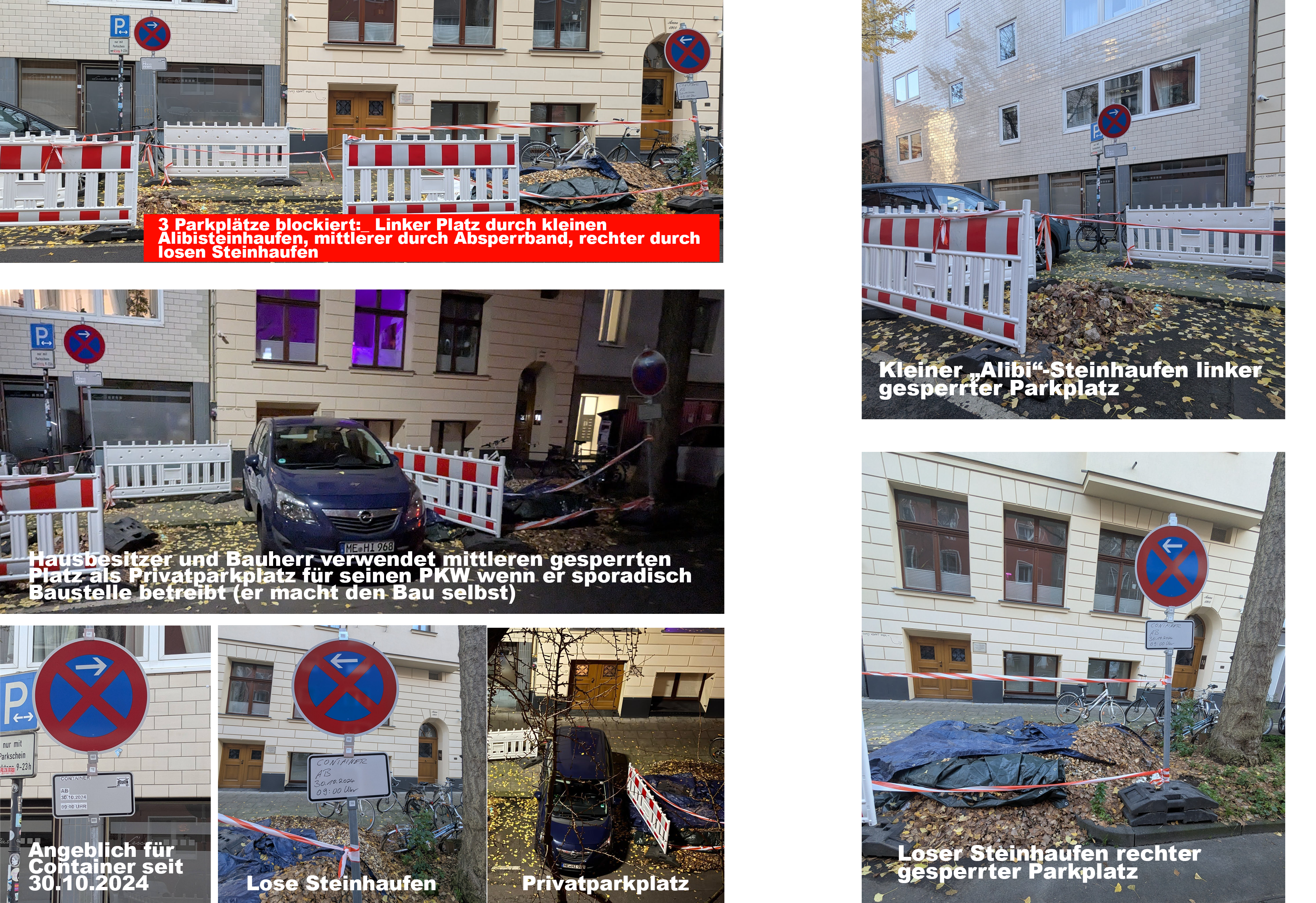 hiermit melde ich die seit langem bestehende, unzulässige und massive Blockade von drei aufeinanderfolgenden öffentlichen Parkplätzen in meiner Nachbarschaft, deren ursprüngliche Genehmigung offensichtlich abgelaufen ist.