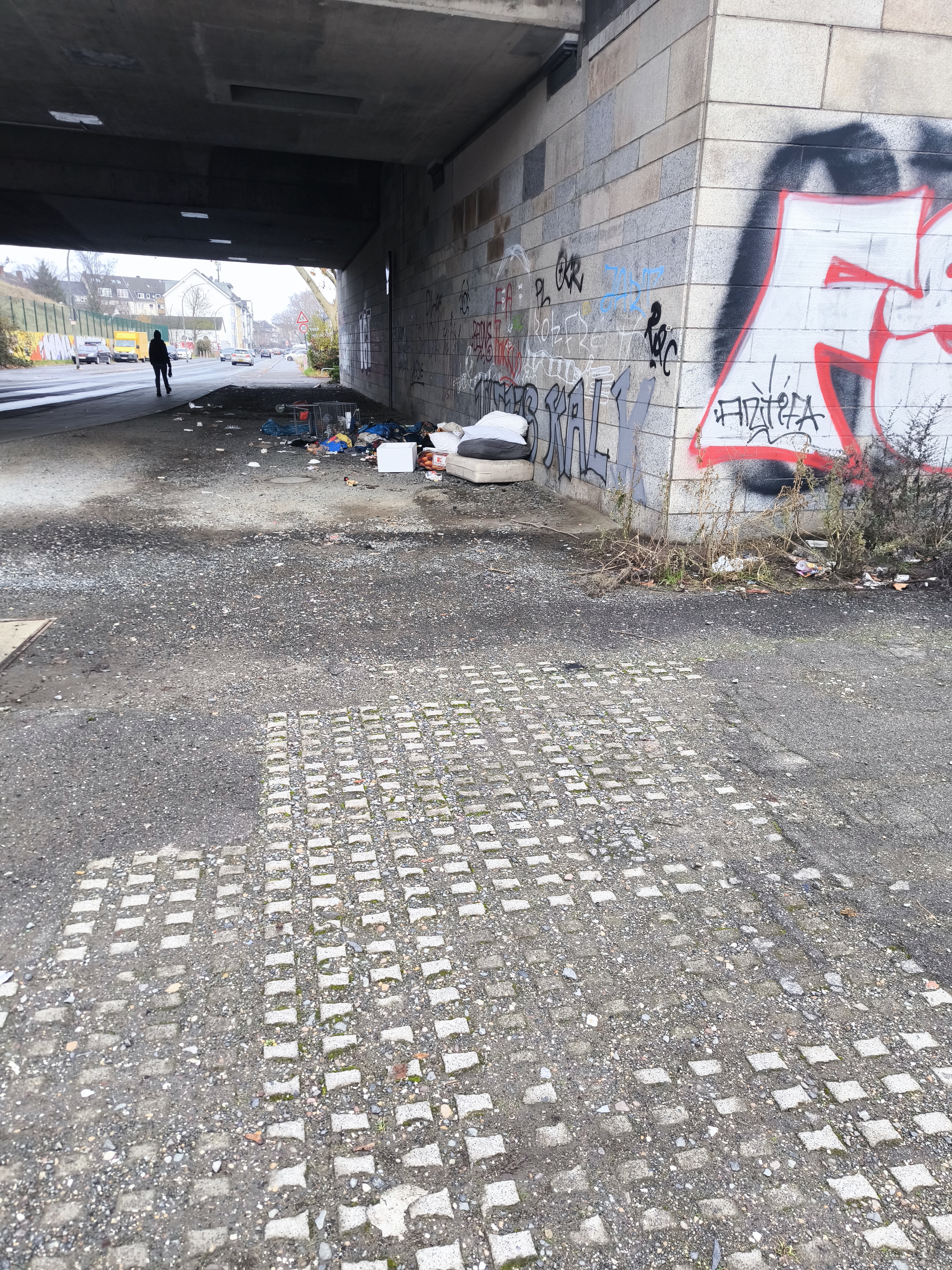 Lange hat ein Obdachloser dort gehaust er ist nicht mehr vor Ort und der Müll von ihm liegt seitdem unter der Brücke weiterhin. Bitte bei der Entsorgung aufpassen, da er den Bereich auch als Toilette genutzt hat.