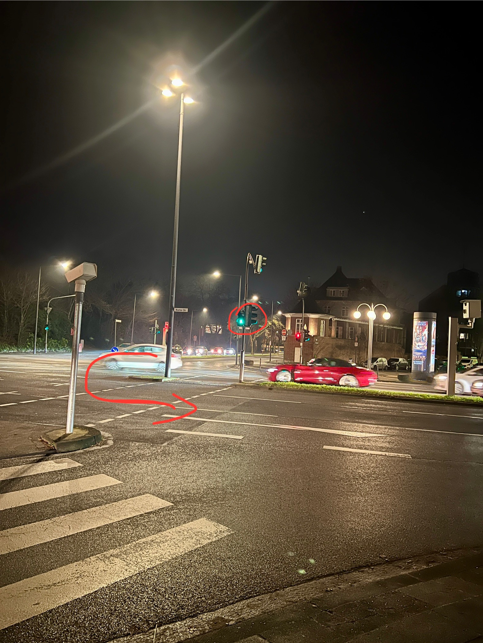 Die Fußgänger aus Richtung Amsterdamerstr. Richtung Elsa-Brändström-Straße sind gefährdet, wenn die Autos kommend aus der Innenstadt Richtung Zoobrücke einen U-Turn machen Richtung Innenstadt. Die erste Fußgängerampel schaltet auf Grün während die Autos auch grün haben.