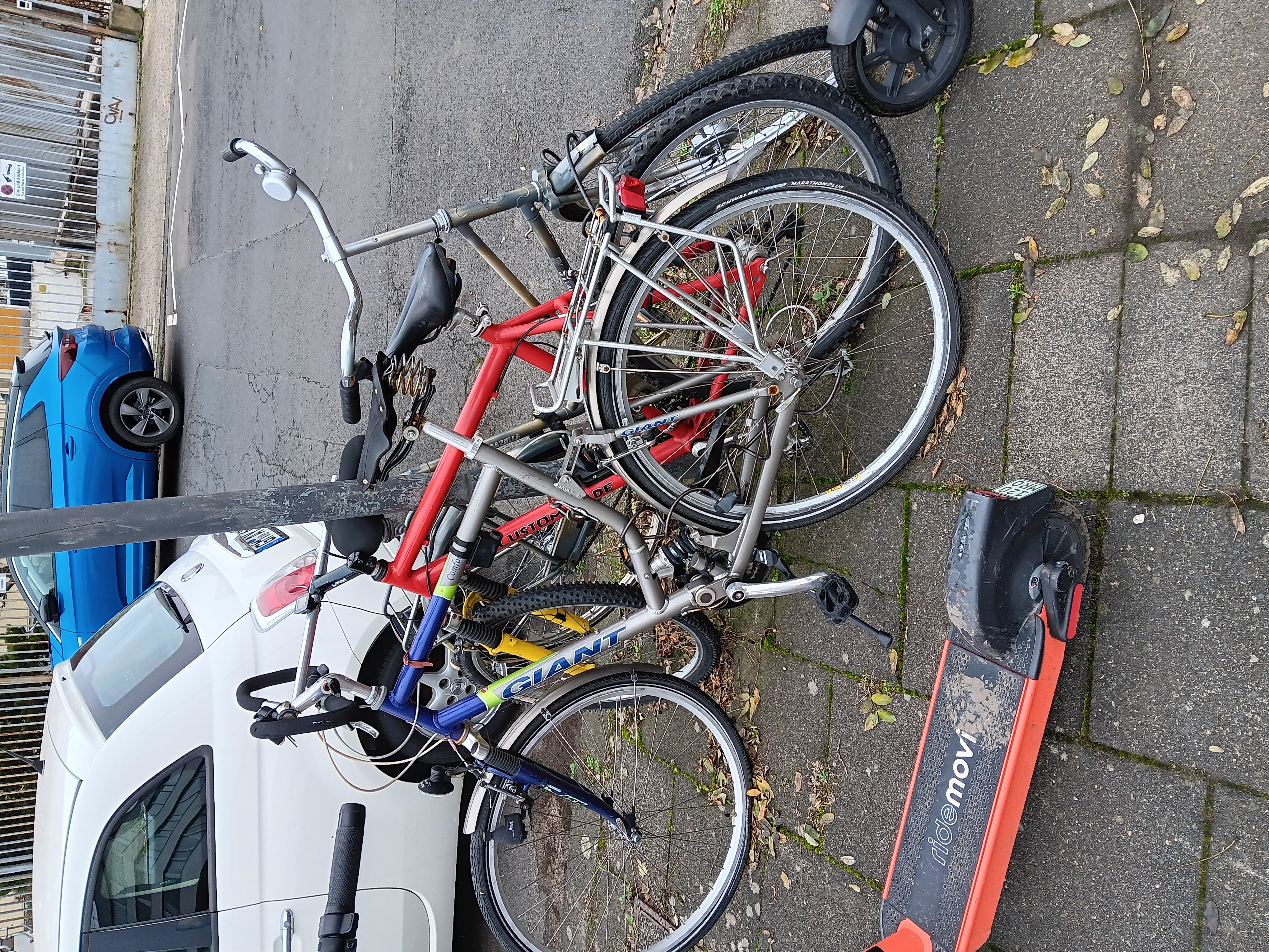 Schrottfahrräder an der Ecke Methweg/Wöhlerstraße. Die Räder stehen dort seit über einem halben Jahr. Rechts neben diesen stehen weiter Räder an einem Mast. Einige waren bereits auch per Aufkleber markiert.