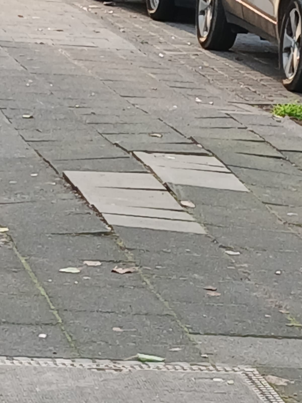 die Einfahrt zum Hof ist eine Berg und Talfahrt wie man auf dem Bild erkennt, dadurch kommen die Gehwegplatten hoch und die Leute mit Gehilfe haben Probleme.
