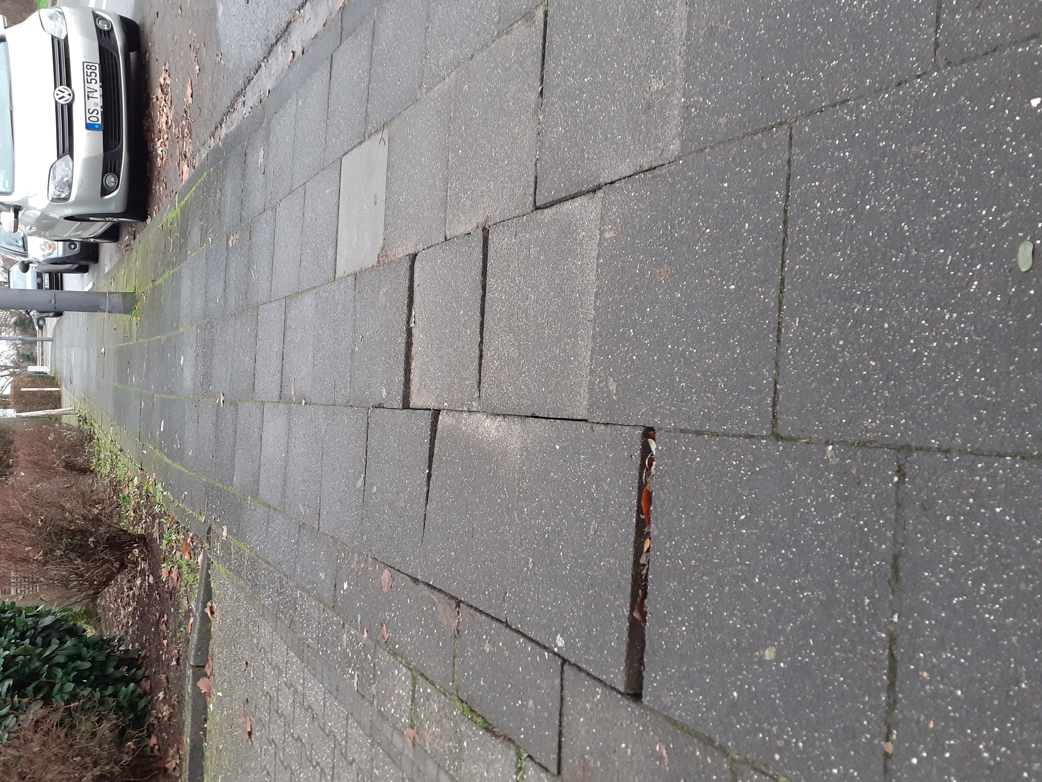 Die Gehwegplatten an der Einfahrt zu unserem Parkplatz sind unterspült und sind eine massive Stolpergefahr für Fußgänger und ältere Bewohner mit Rollatoren.