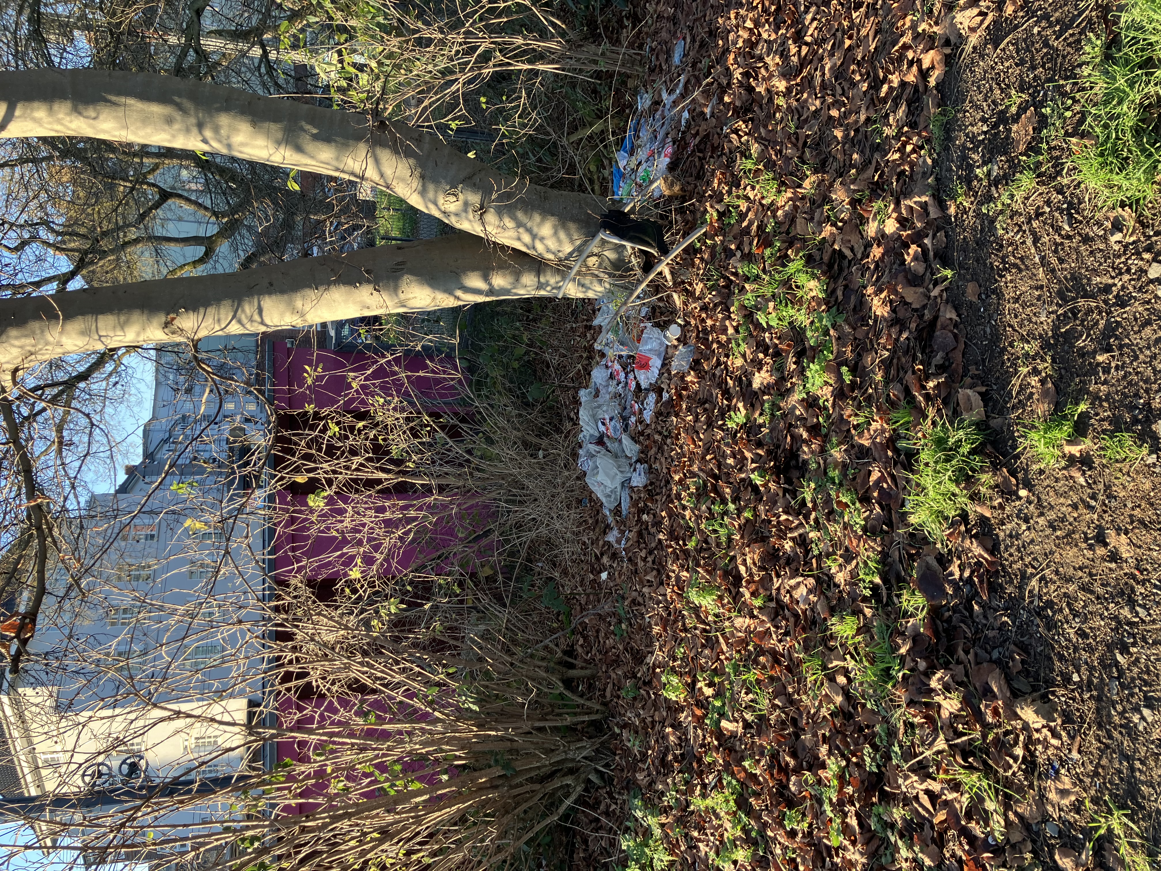 Links neben dem Eingang zum Südstadion führen Stufen zu einem Waldweg. Nach wenigen Metern liegt links des Weges gleich hinter dem bunten Trafo-Häuschen eine große Menge an gepressten Plastikflaschen, offenbar aus einem Rückgabeautomat.