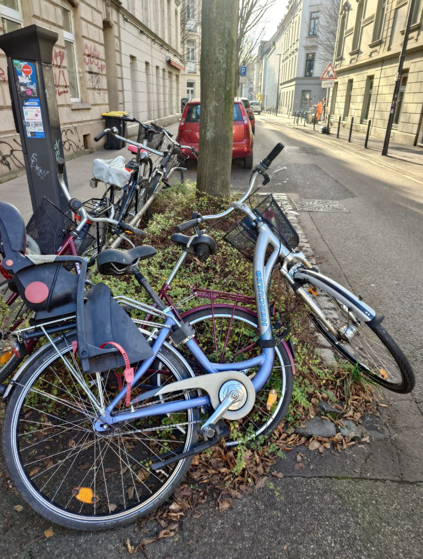 Das Fahrrad mit dem Kindersitz steht/liegt seit mehreren Wochen an dieser Stelle. Der Kindersitz ist mit Moos bewachsen. Das Fahrrad ist so an dem kleinen Geländer der Baumumrandung festgeschlossen, dass es nicht aus dem Weg geräumt werden kann. So wie es jetzt liegt, ragt das Vorderrad teilweise auf die Straße und beeinflusst damit den Verkehr.