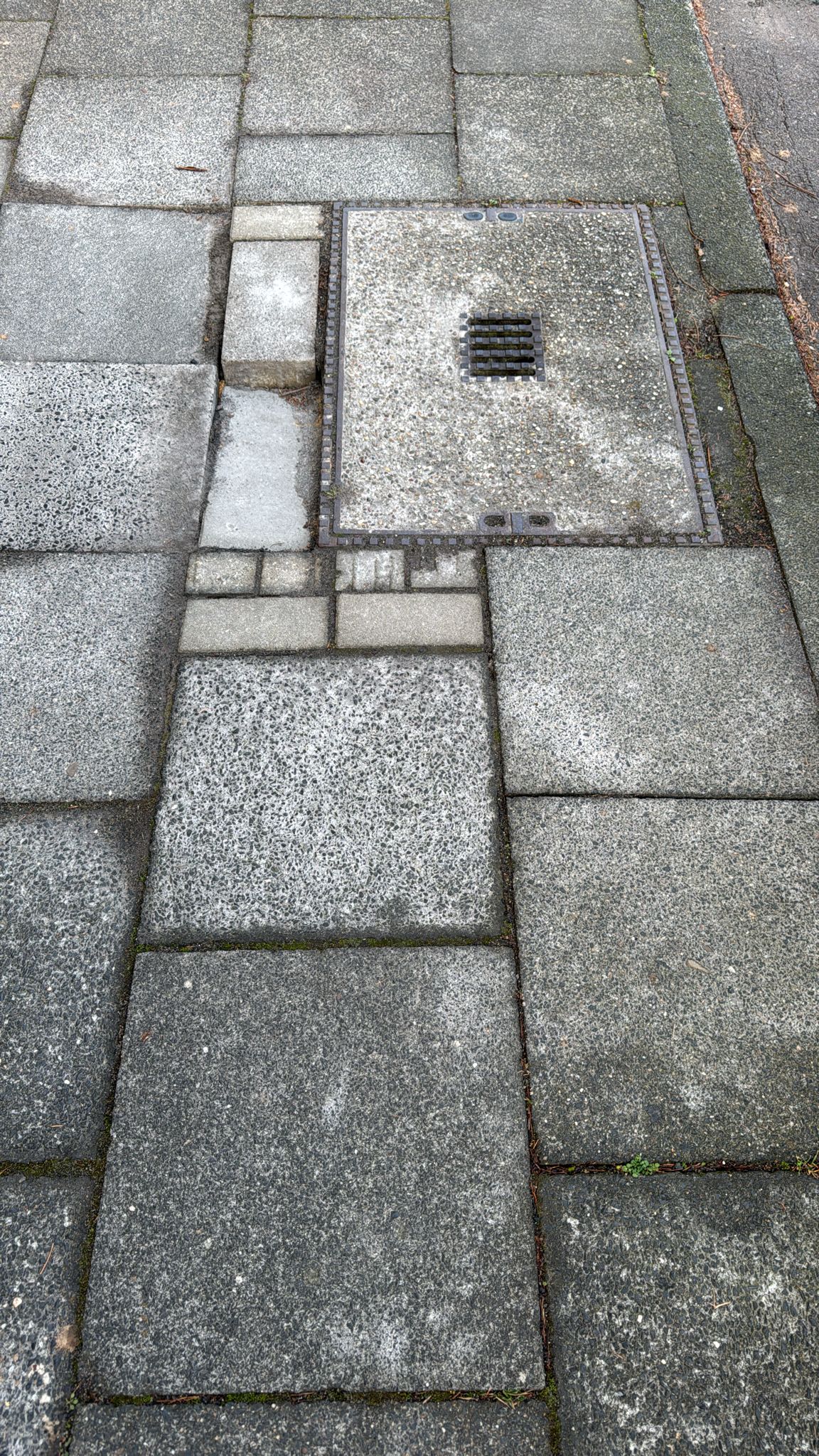 Auf dem Bürgersteig vor dem Hauseingang in der Weilerswister Str. 25 in 50968 Köln ist am Bereich des Kanals eine Gehwegplatte stark abgesackt und bildet nun eine gefährliche Stolperstelle.