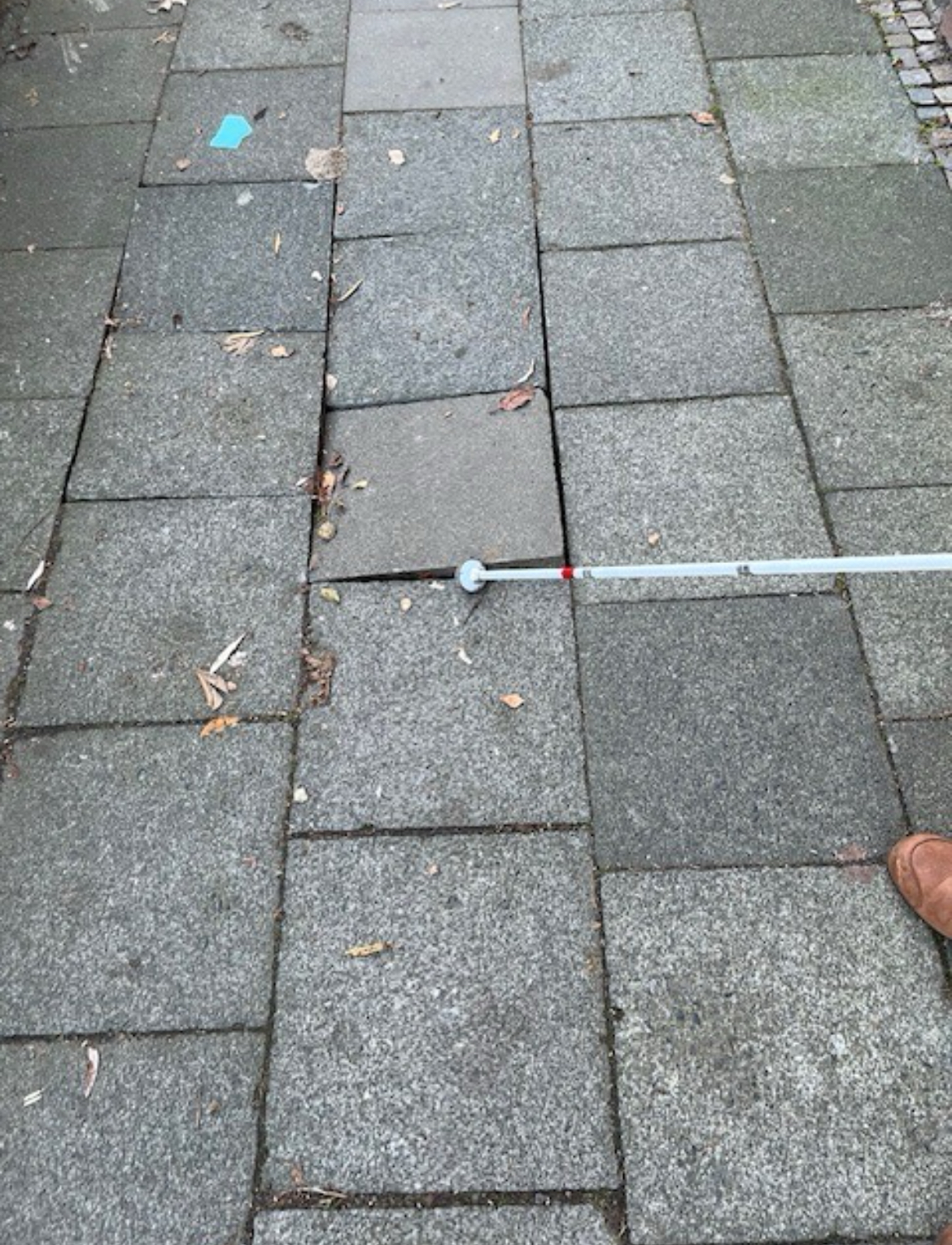 Seit Monaten wieder lose Gehwegplatten, etwa 2-3 Stück. Diesmal richtig tiefes Loch in dadurch große Sturzgefahr. Ich, als Blinder, bin besonders gefährdet.