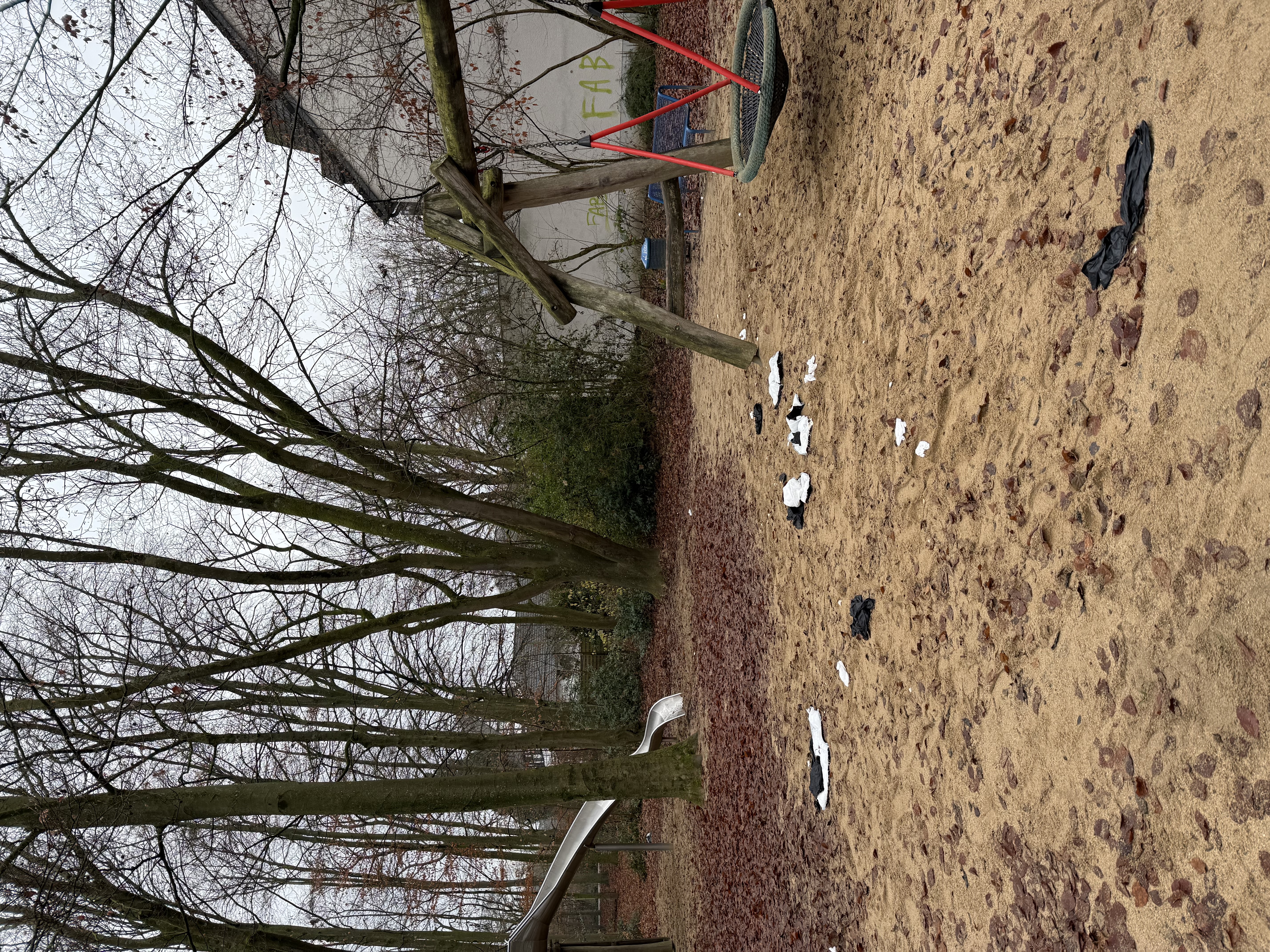 Spielplatz mit zerrissenen Textilien dekoriert. Watte und Stoffe liegen herum