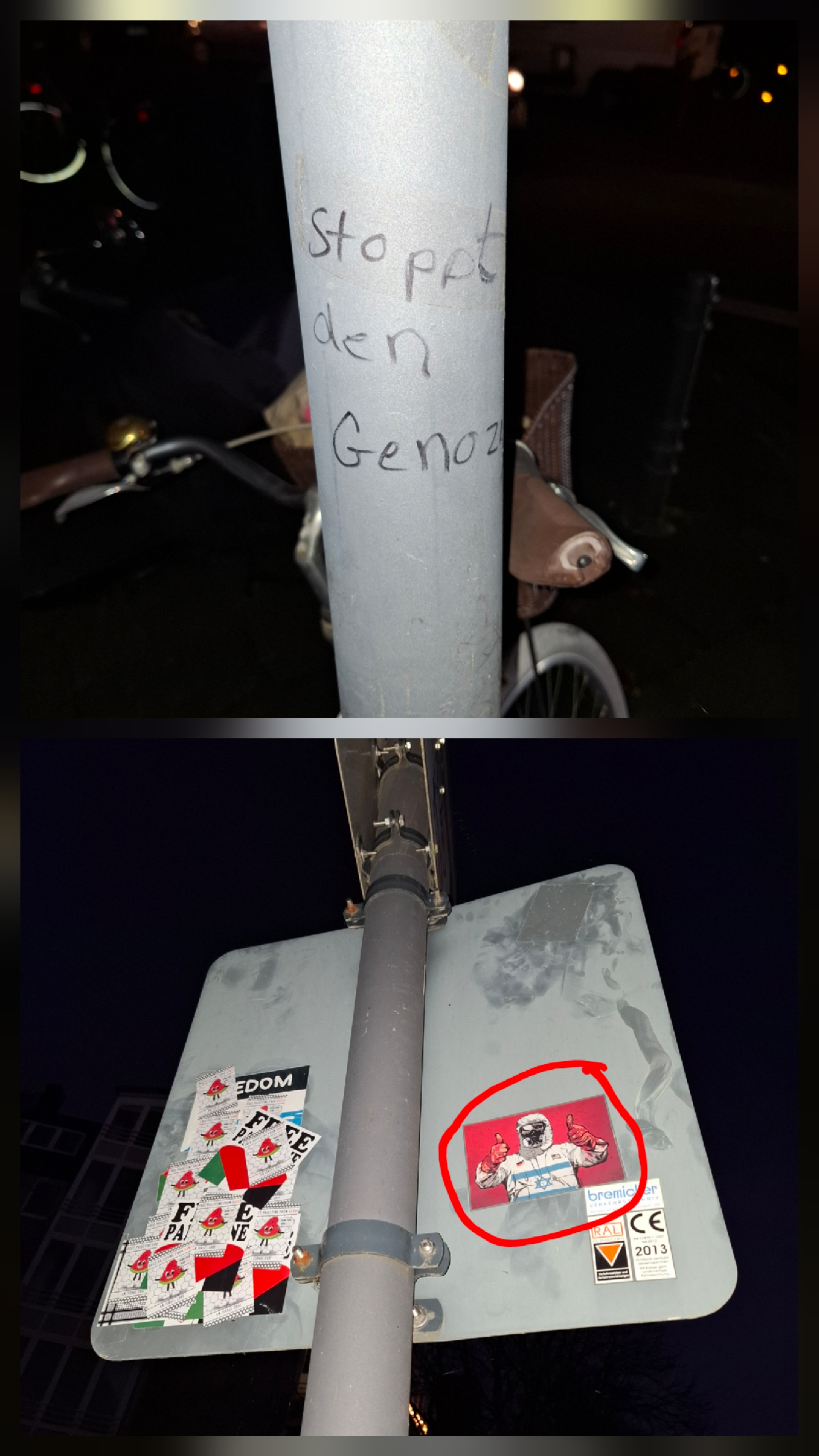 massive antisemitische Hetze (siehe v.a. den markierten Sticker), bitte dringend entfernen!