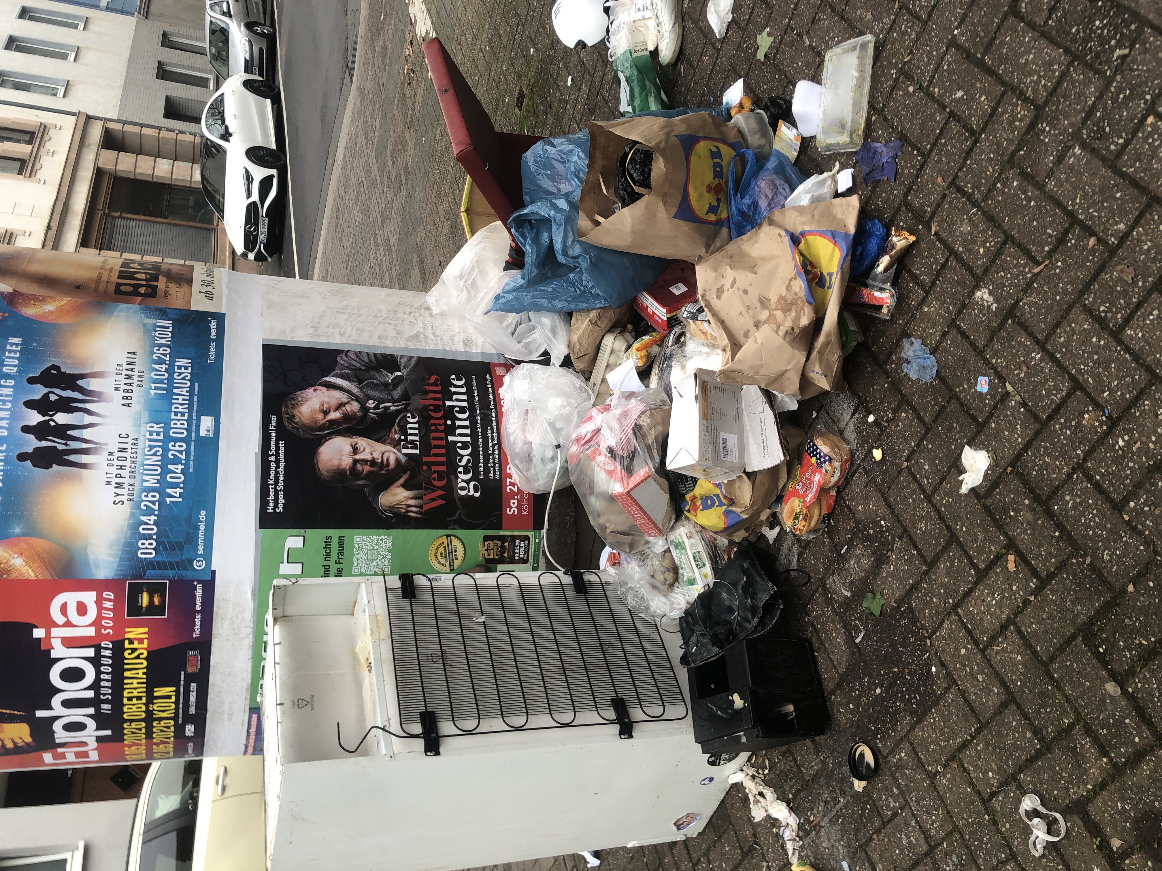 An der Litfaßsäule vor Rixdorfer Str 13 liegt wilder Müll - für Ratten geeignet- und es steht ein Kühlschrank als Sondermüll.