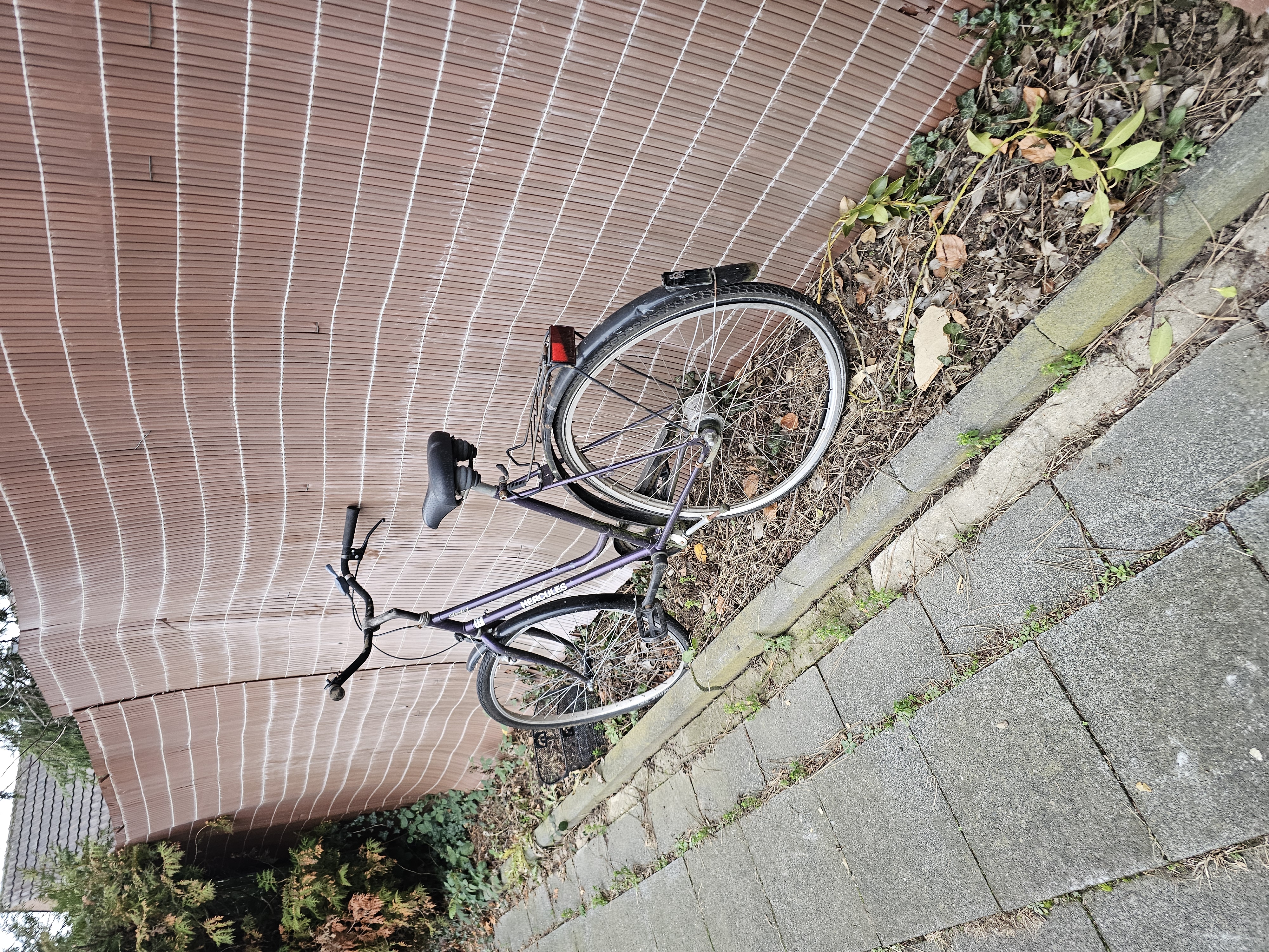 Schrottfahrrad. Fahrrad ist beschädigt und fahruntüchtig. Steht unangeschlossen gegenüber der Hausnummer an einer Mauer.
