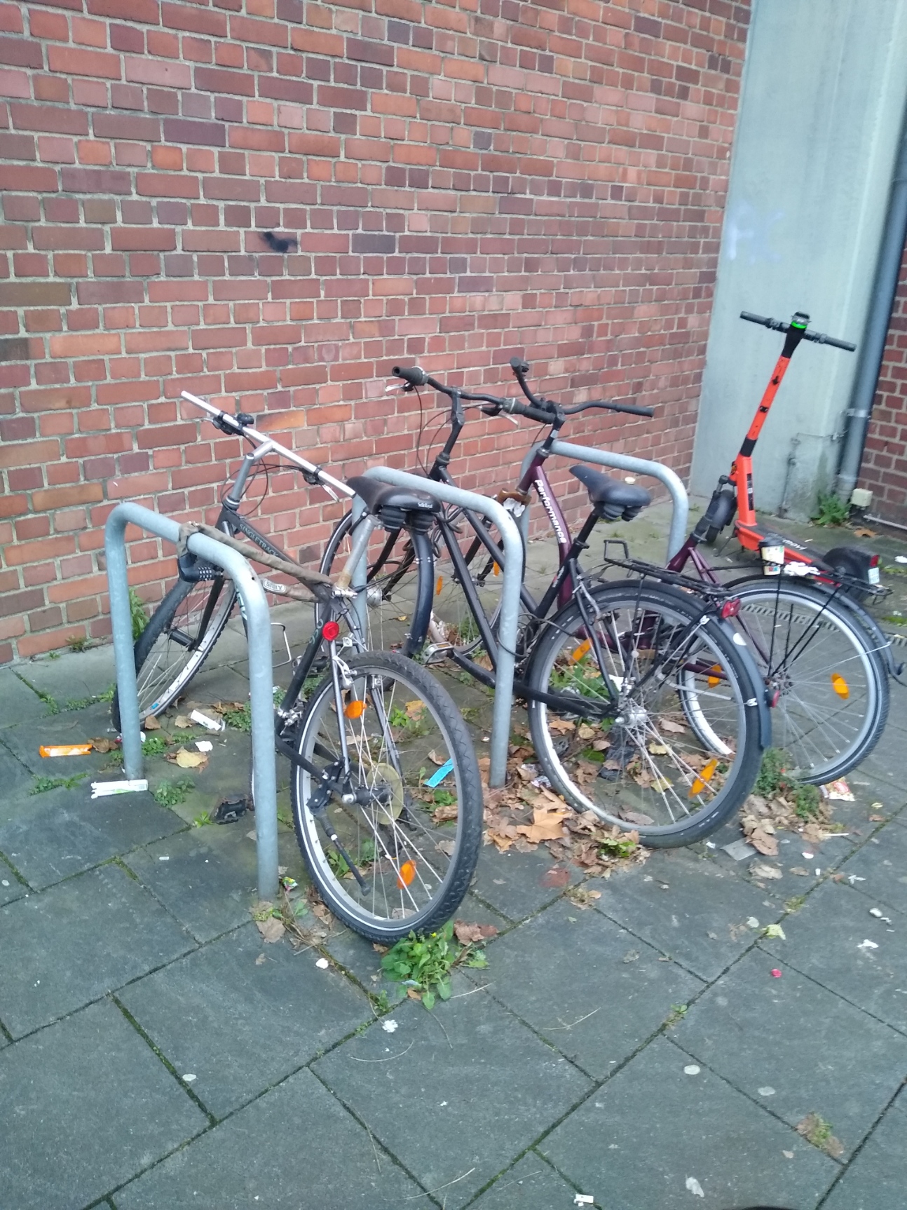 Drei offenbare Fahrradleichen, teilweise ohne Sattel