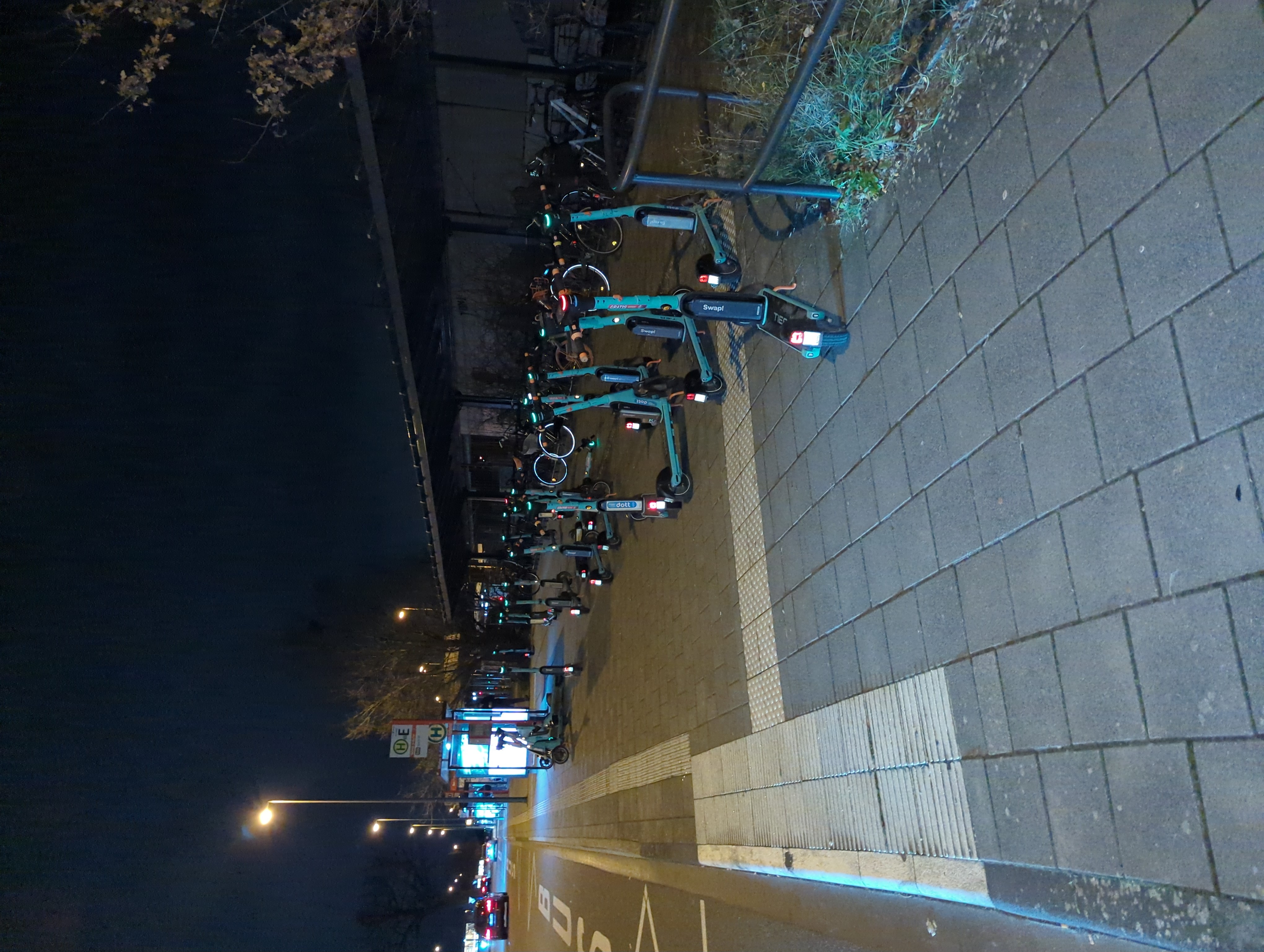 Ungeordnet herumstehende Miet-E-Roller am Fußgängerübergang zur Straße. Fahrradfahrer können die öffentlkchen Fahrradstellplätze nicht erreichen. Barrierefreiheit für Blinde oder gehbehinderte Personen ist nicht (mehr) gewährleistet.
