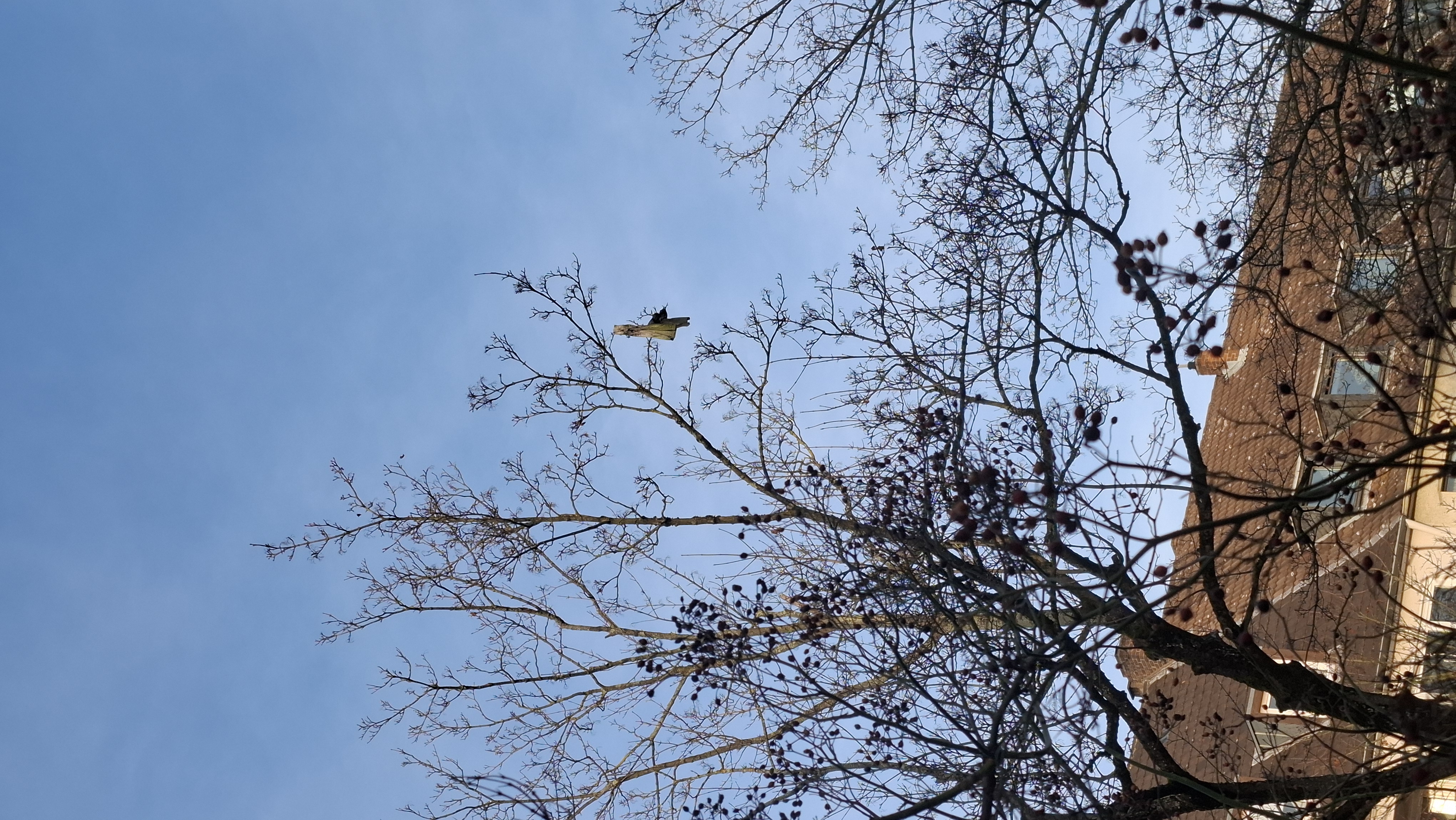 Ein Lappen oder Kleidungsstück hängt in den Ästen eines Baumes. Dies ist bereits seit mehreren Monaten der Fall.