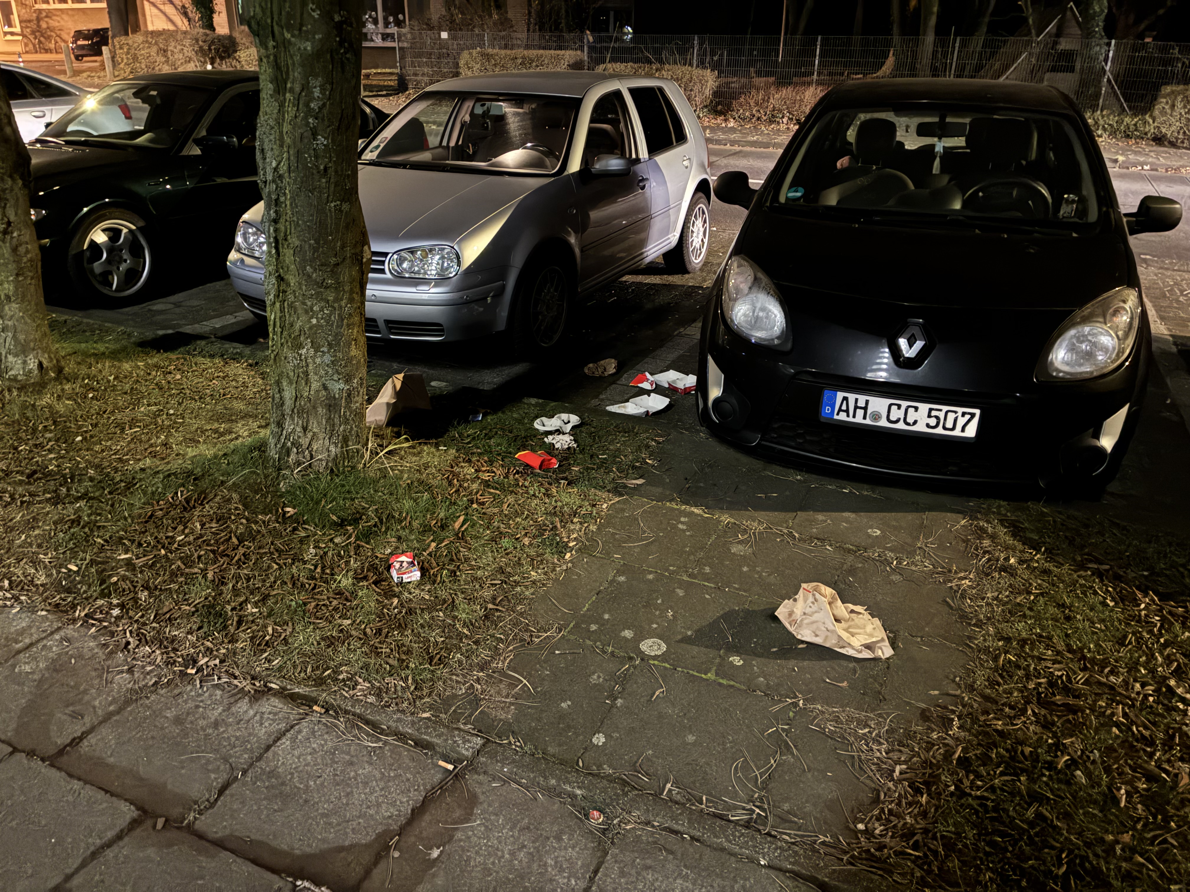 Hier wurde auf einem öffentlichen Parkplatz privater Müll entsorgt, laut Verpackung McDonald‘s-Müll.