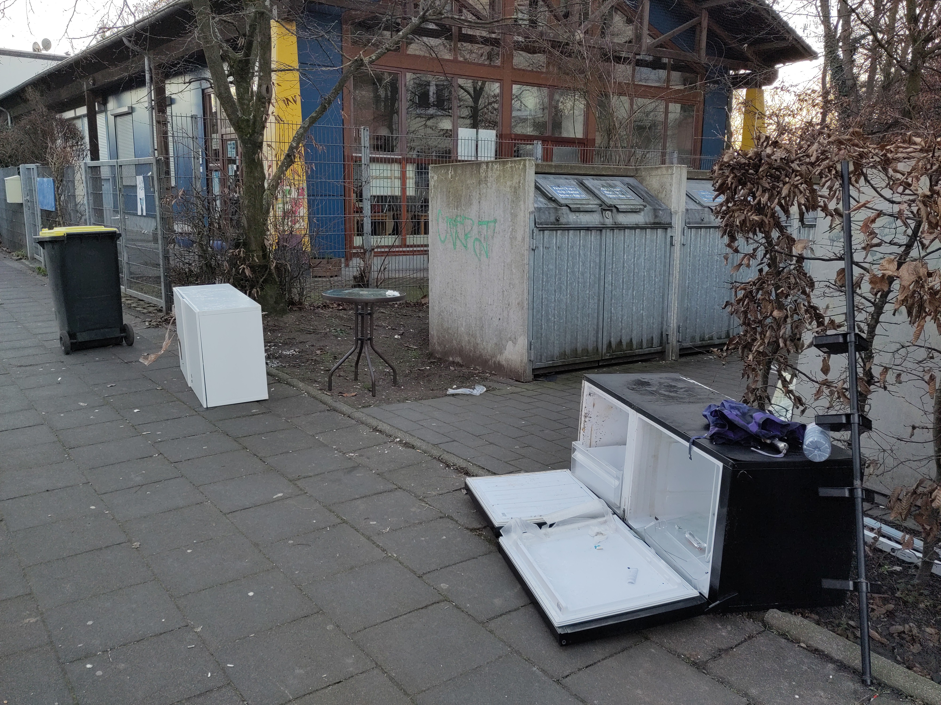 Hier liegt win Kühlschrank, ein Tischchen und ein Hängeschrank rum.