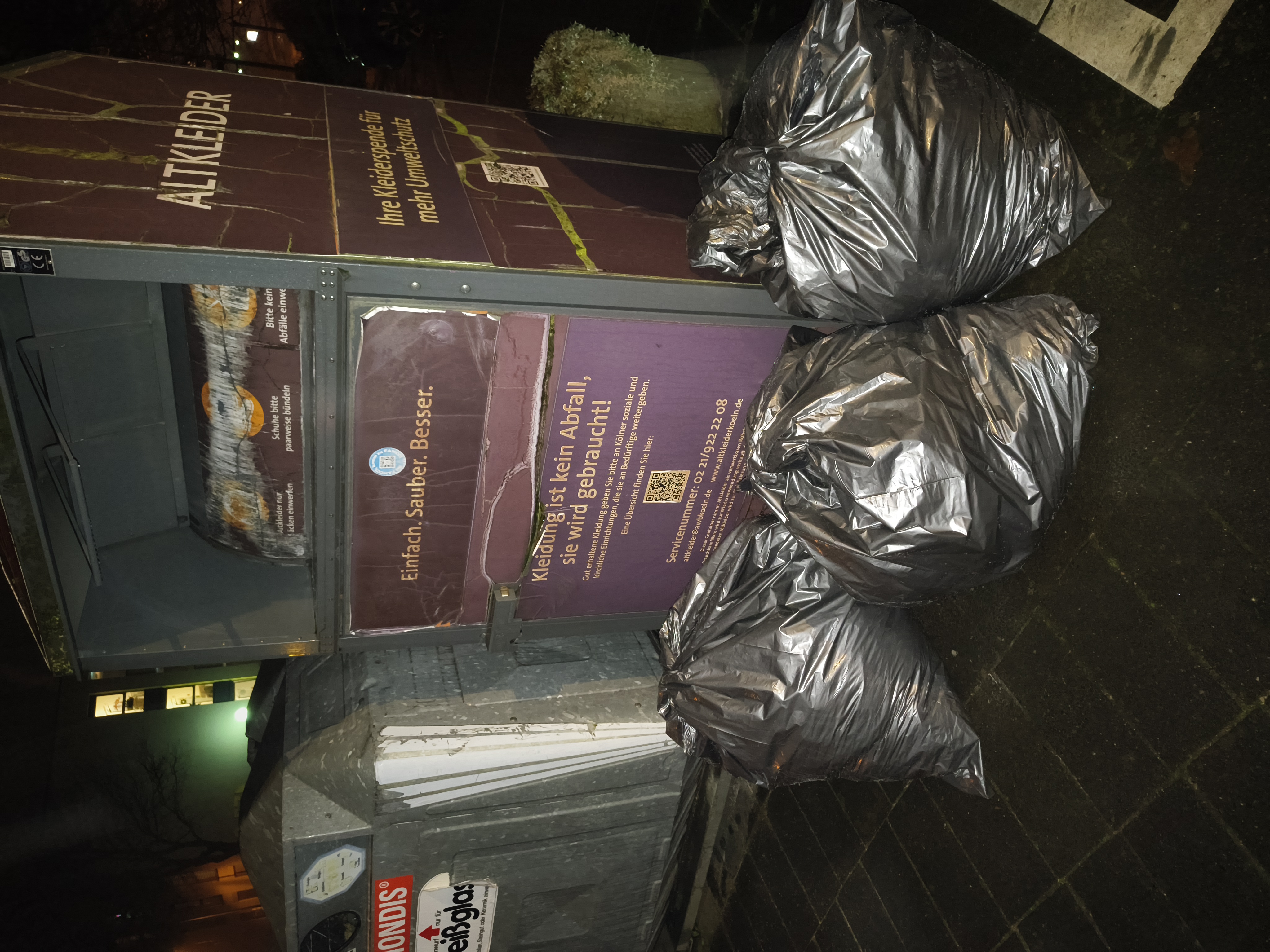 Drei große, graue Säcke mit vermutlich Kleidungsstücken stehen vor dem vollen Altkleidercontainer Friedensstr./Ecke Tiergartenstr. 1.