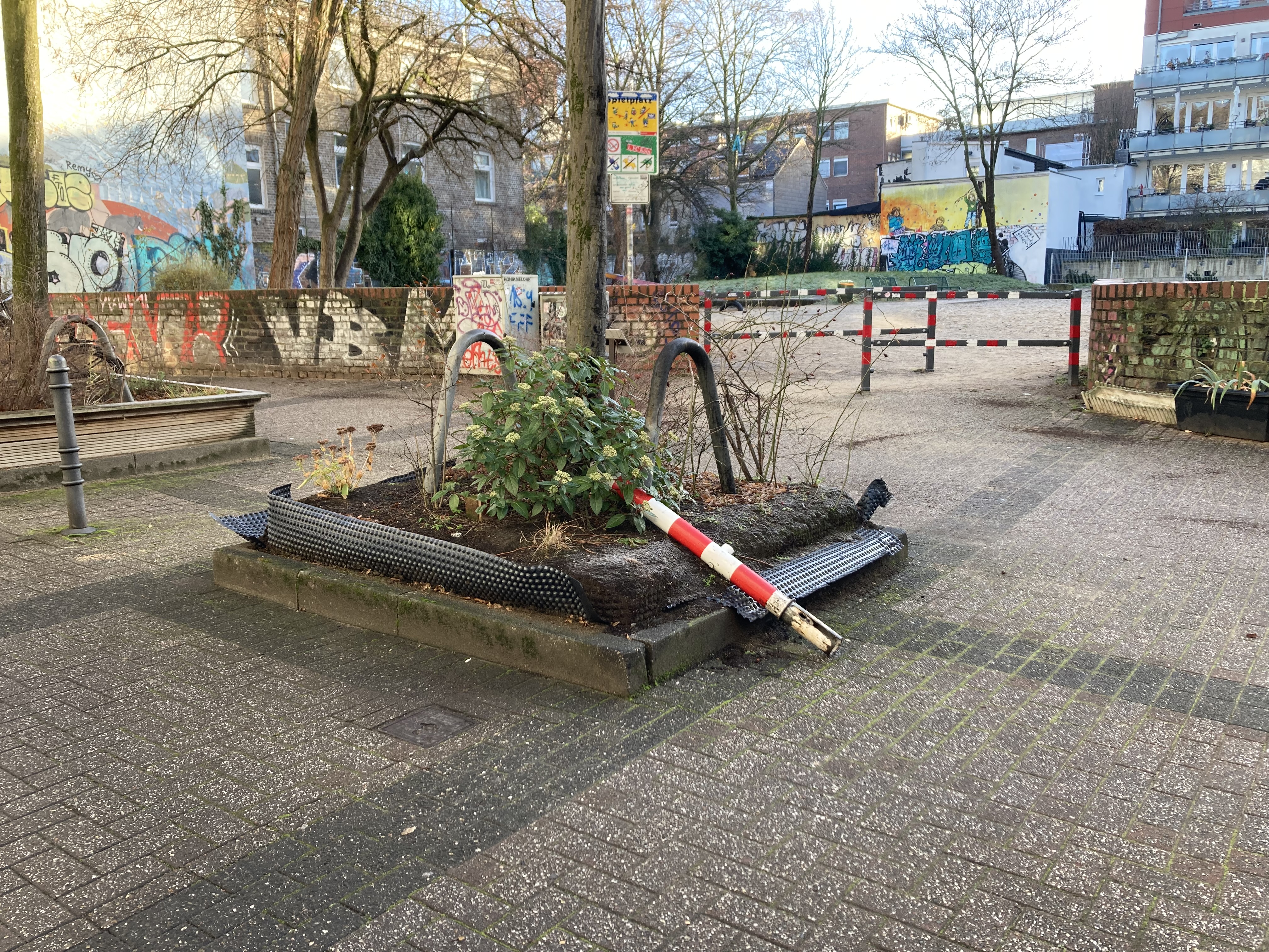 Leider seit über einem Jahr ohne Umrandung und nun Ablage für Poller