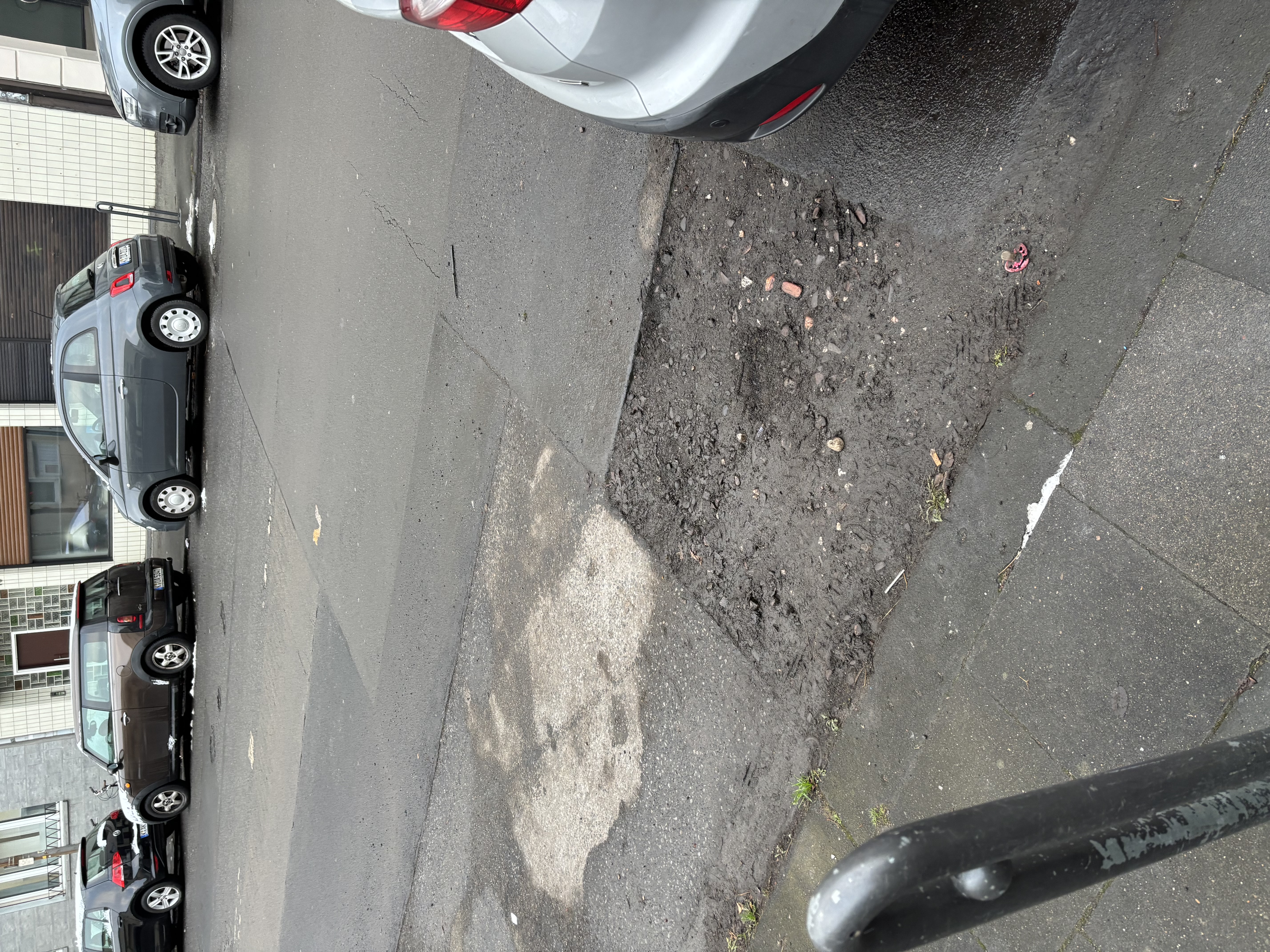 Straßendecke nicht geteert. Fläche ca. 1m x 1m. Da die Fläche teilweise durch Autos zugeparkt ist, wird zur Reparatur wahrscheinlich eine Absperrung nötig sein.