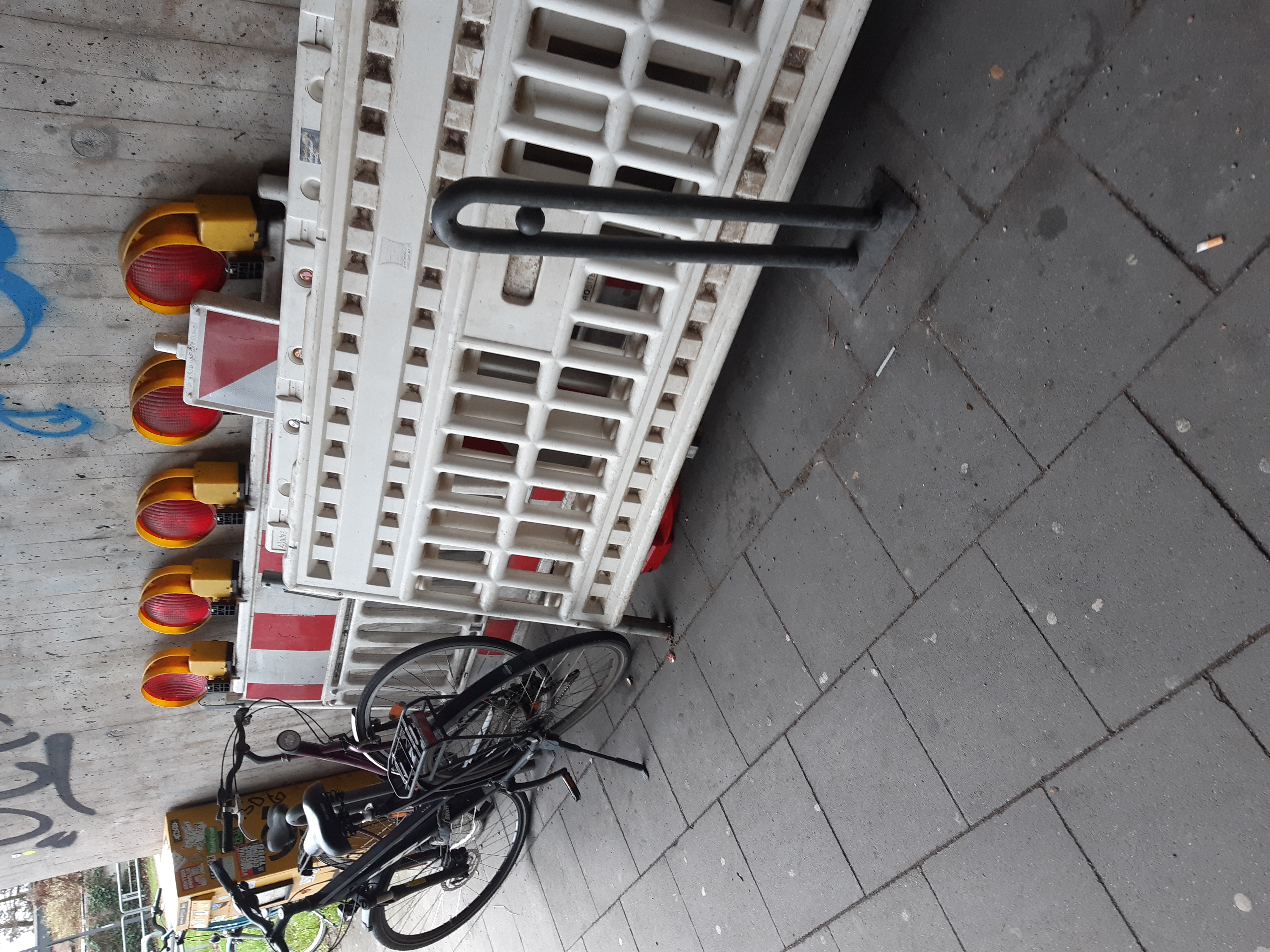 Schrottfahrrad und Absperrungen stehen schon 1 Jahr dort vergessen worden bei Filmaufnahmen.
