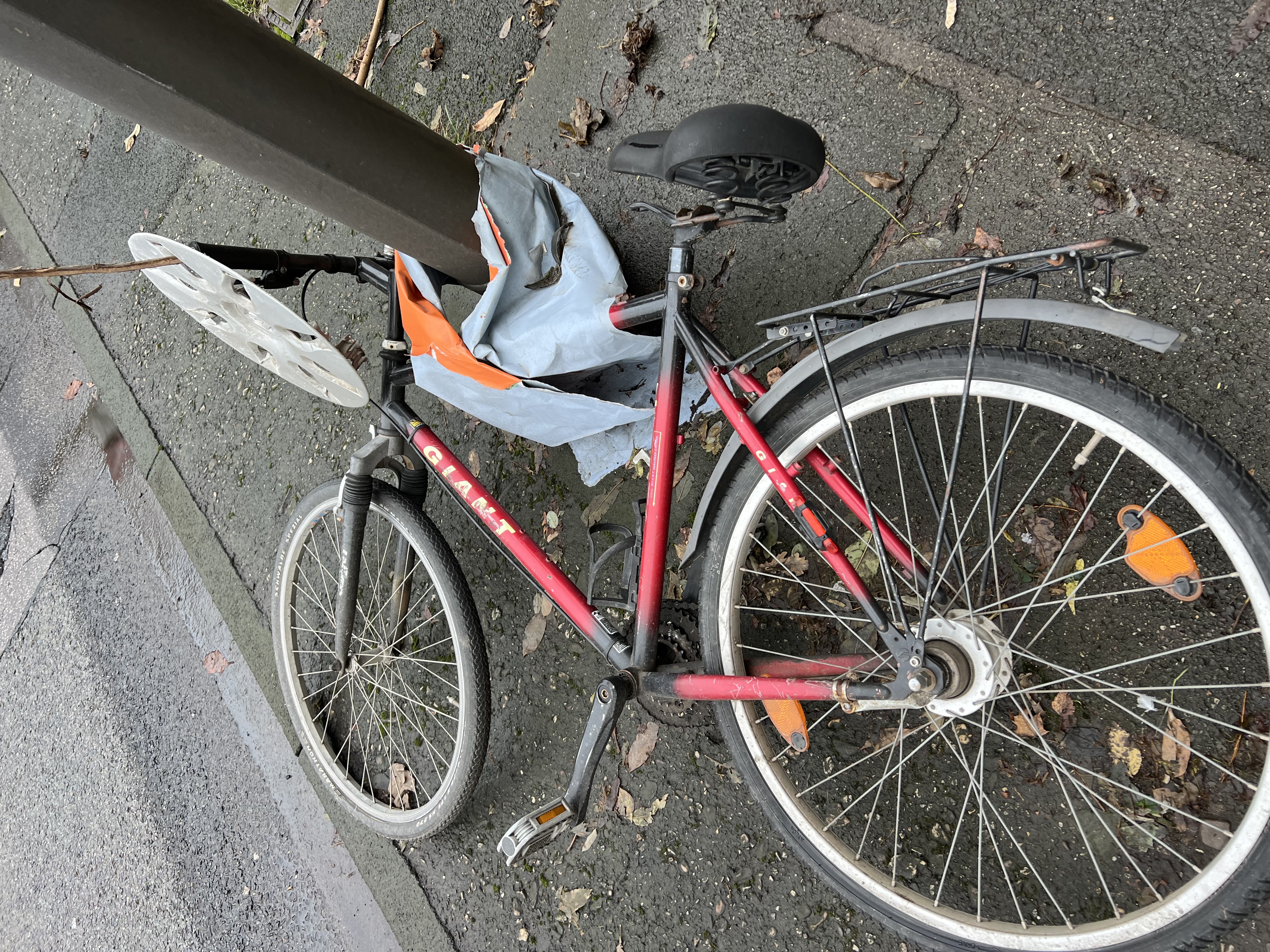 Gegenüber Hornstrasse auf Bürgersteig am Strassenrand der Inneren Kanalstrasse - Fahrradmuellgebilde mit spitzen Scherben