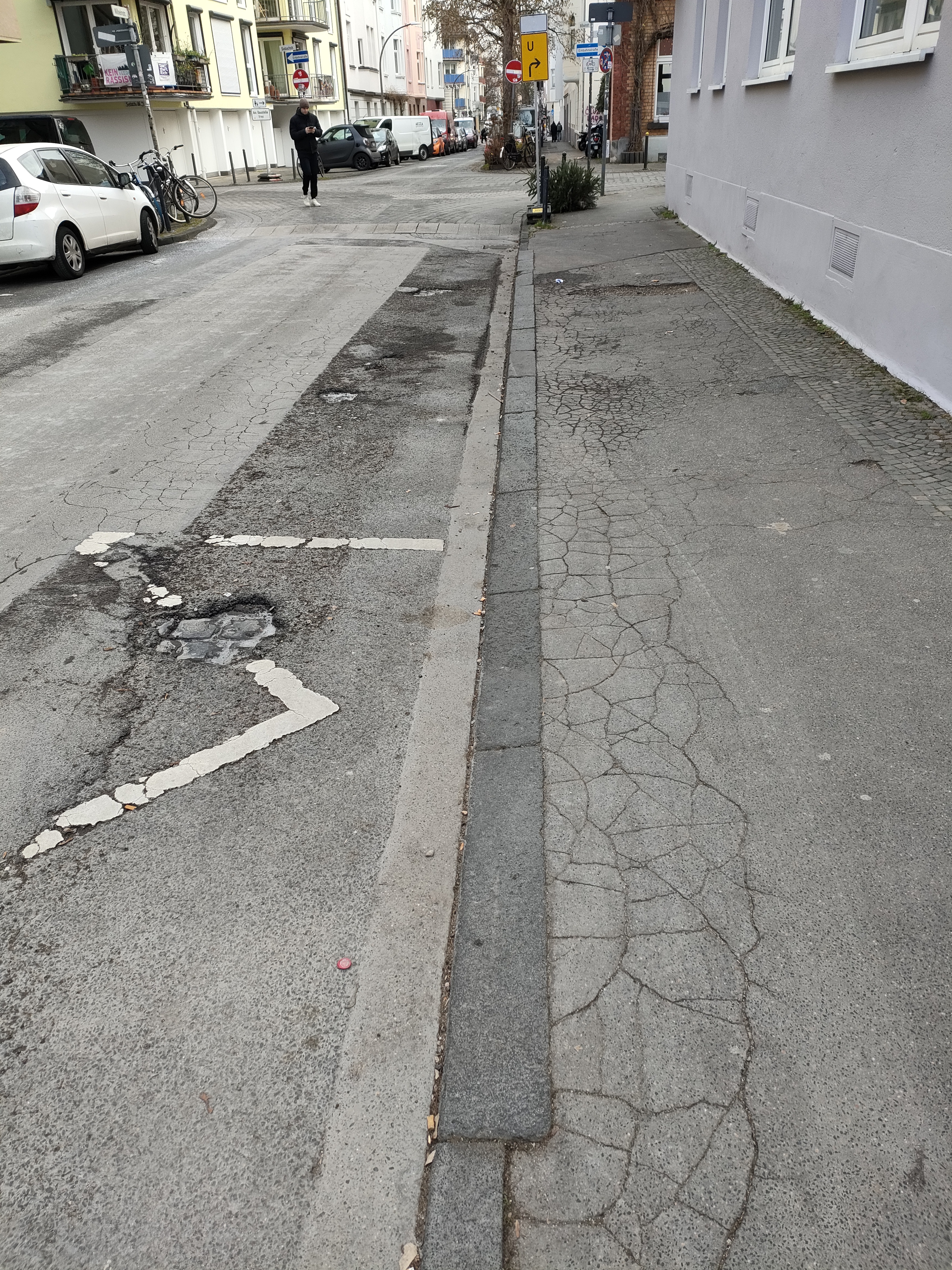Der Bürgersteig und auch die Straße nahe der Ecke zur Siebachstraße, gegenüber der früheren Wirtschaft "Siebach Eck" ist defekt.