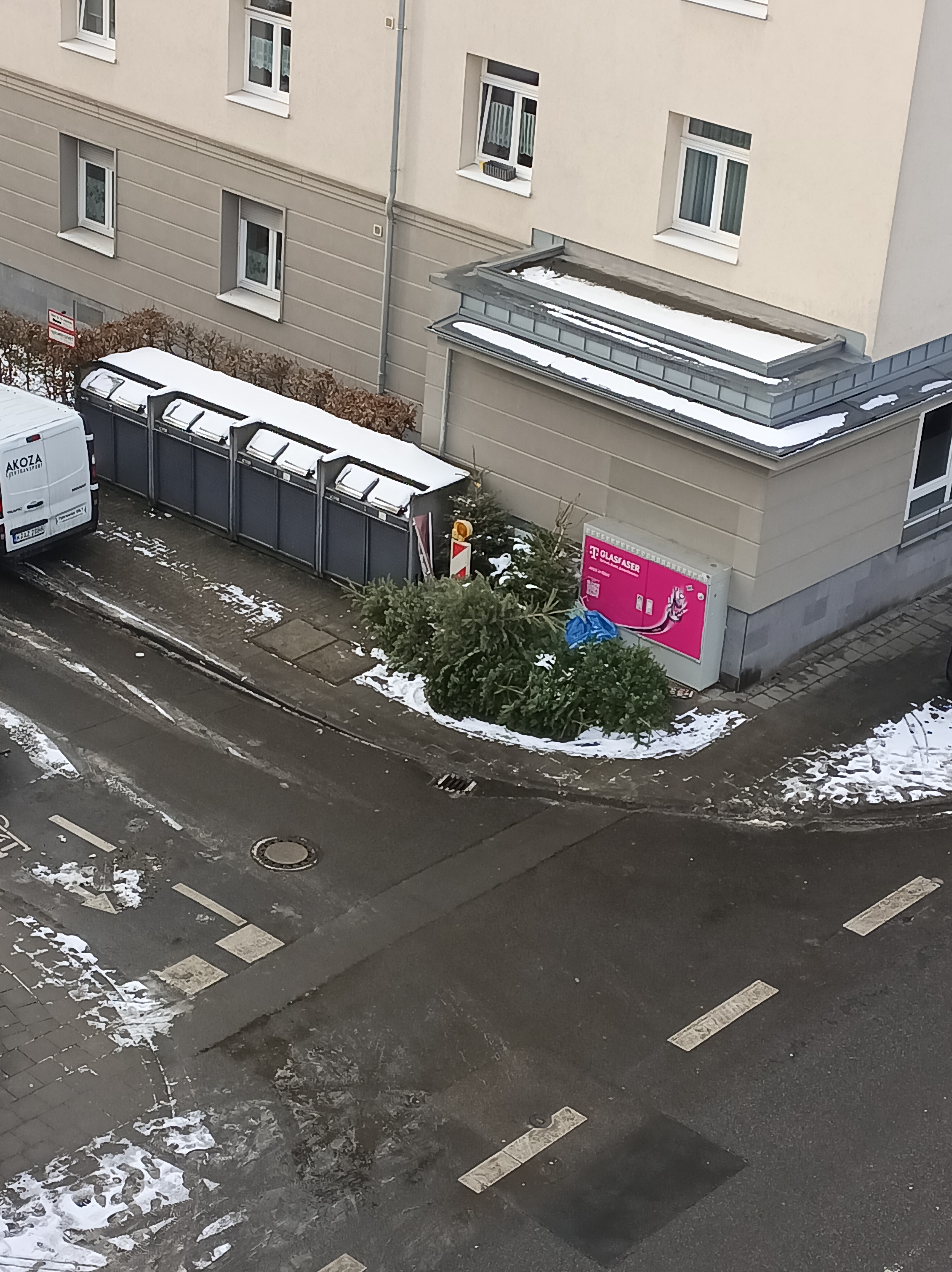 Die Weihnachtsbäume und erste von Silvesterfeuerwerk sind eine unglückliche Kombi und sorgen für zusätzlichen Müll der einfach abgelegt wird. Außerdem ragt es schon bis auf den Gehweg.