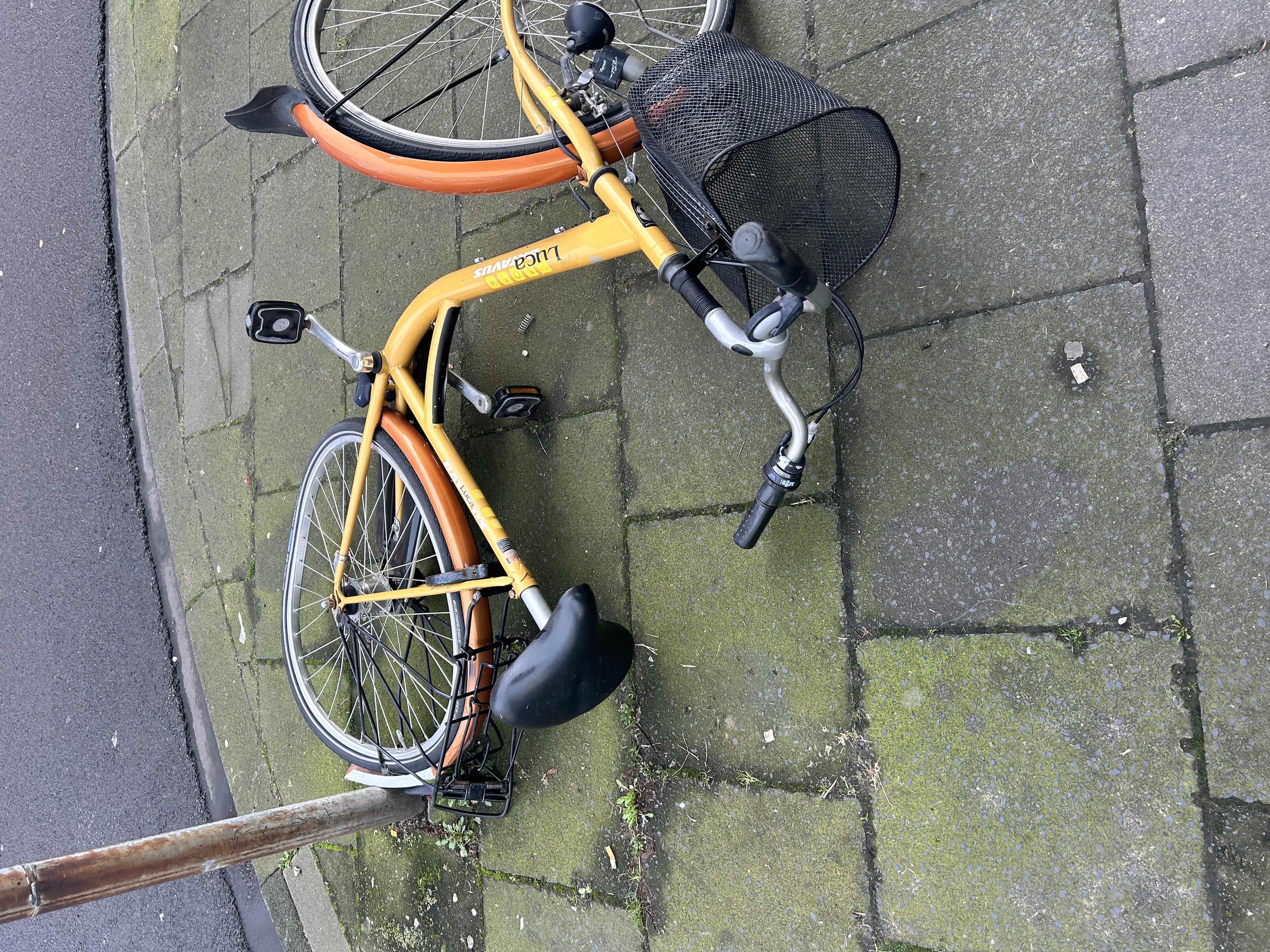 Hallo, an der Kreuzung Bismarckstraße/Kamekestraße liegt ein gelbes SChrottrad. Danke