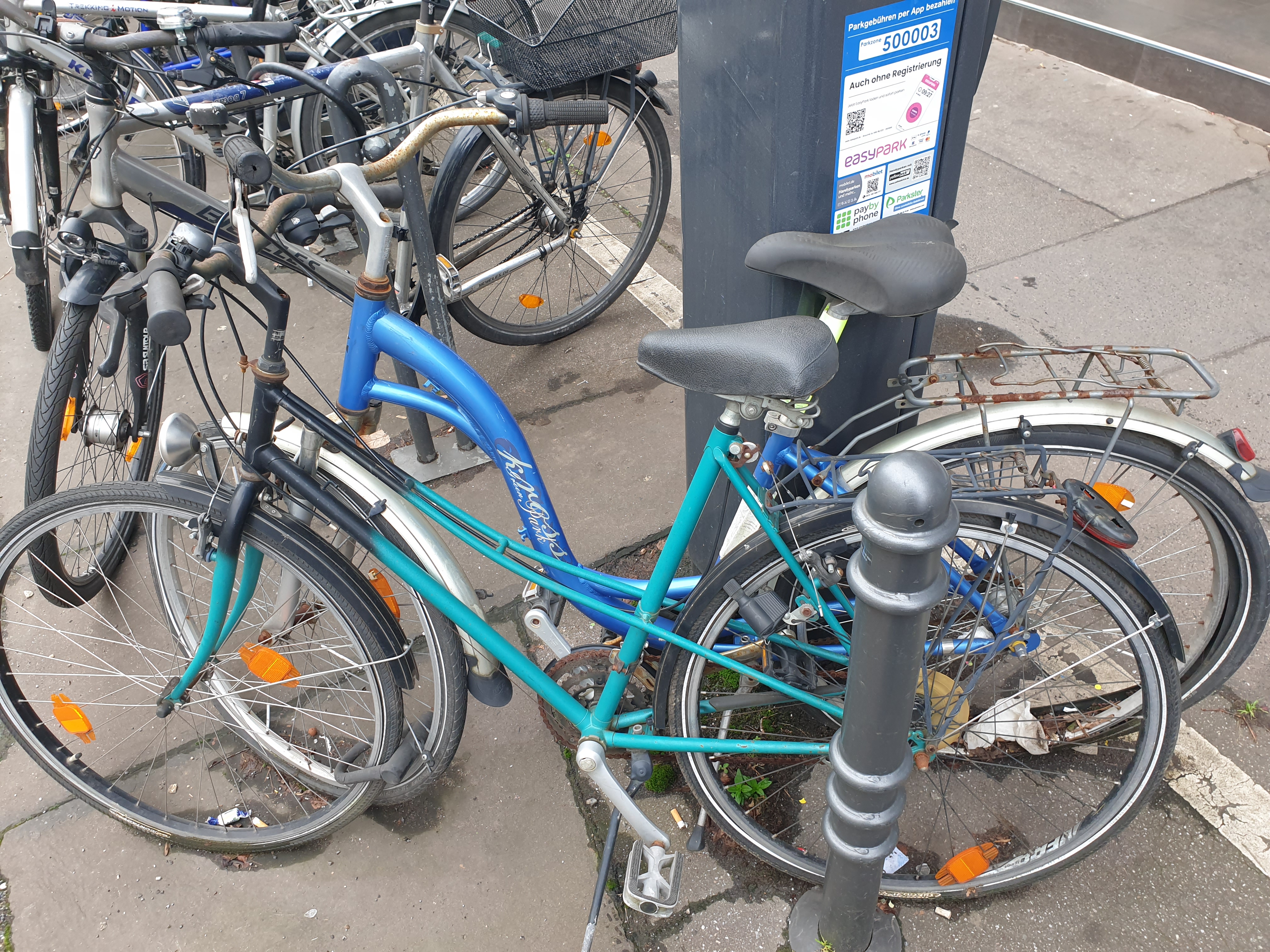 Das hintere Fahrrad hat bereits einen längs nicht mehr lesbaren, städtischen Fahrrad-Entsorgung-Aufkleber.