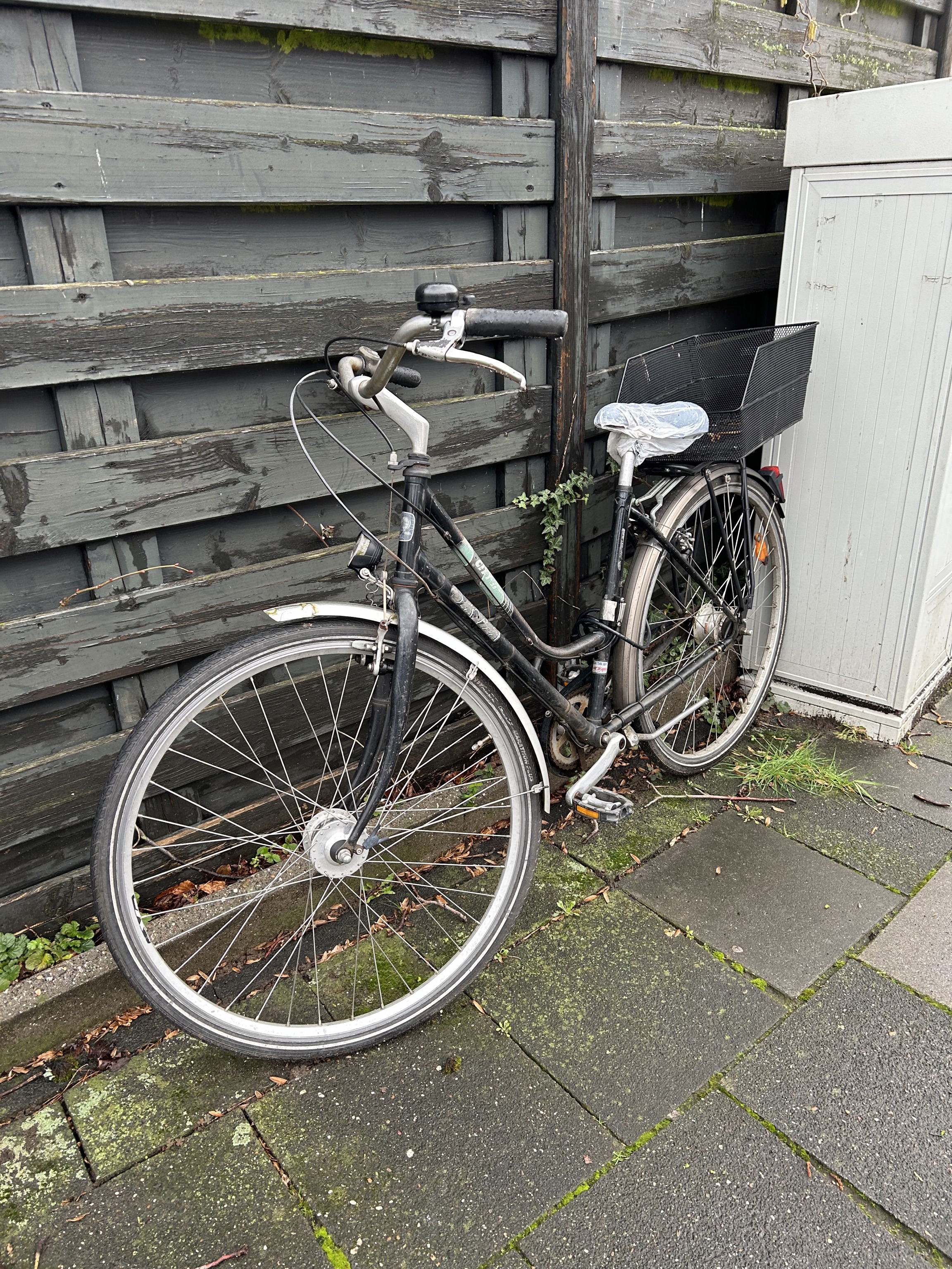 Herrenloses Fahrrad in 50859 Köln-Lövenich, auf der Ecke Spitzangerweg/Ahrstraße, neben Stromkasten, vor Monaten dort abgestellt.