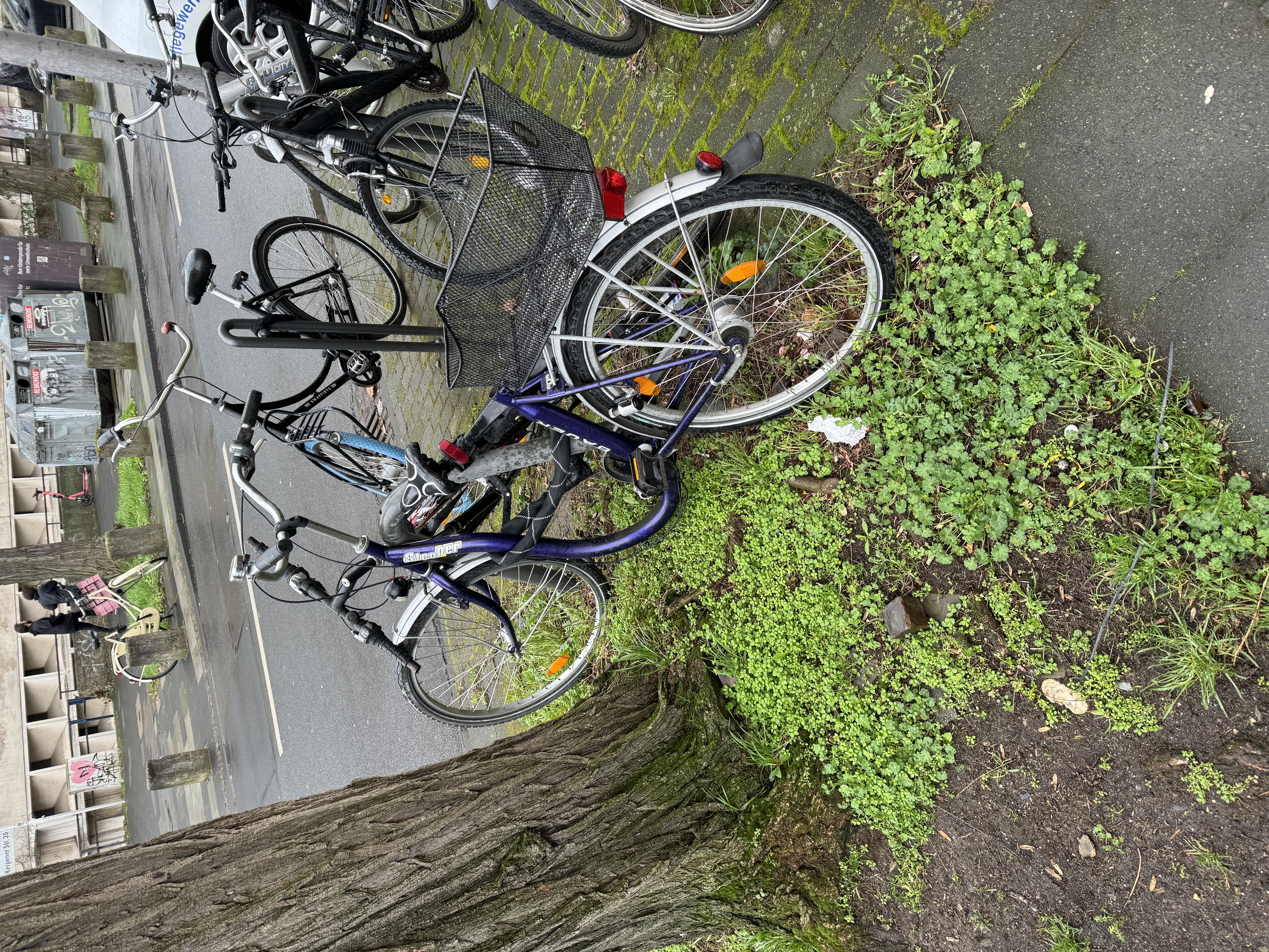 hier steht seit mind. 1 Jahr dieses Lila Fahrrad ohne Sattel herum, es ist Schrott
