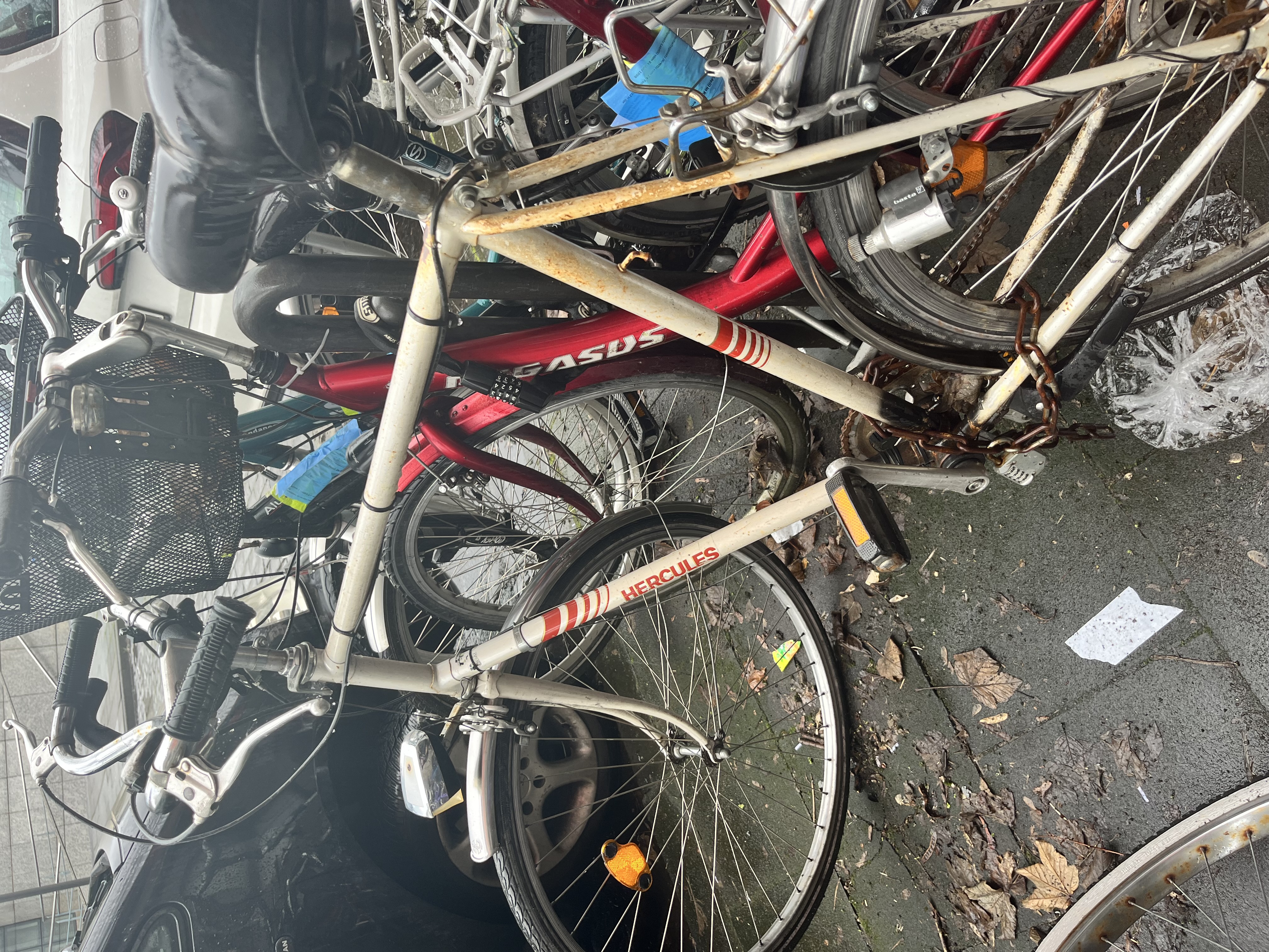 es ist leider der Wurm drin : seit nun fast einem Jahr versuche ich diese Schrotträder entsorgen zu lassen . Nun haben die gelb markierten Räder , blaue Zettel , was ja hoffentlich bedeutet , dass Sie bald weg sind . Aber 2 Räder die definitiv herrenlos sind , blieben unbeachtet vom Entsorgungsteam .