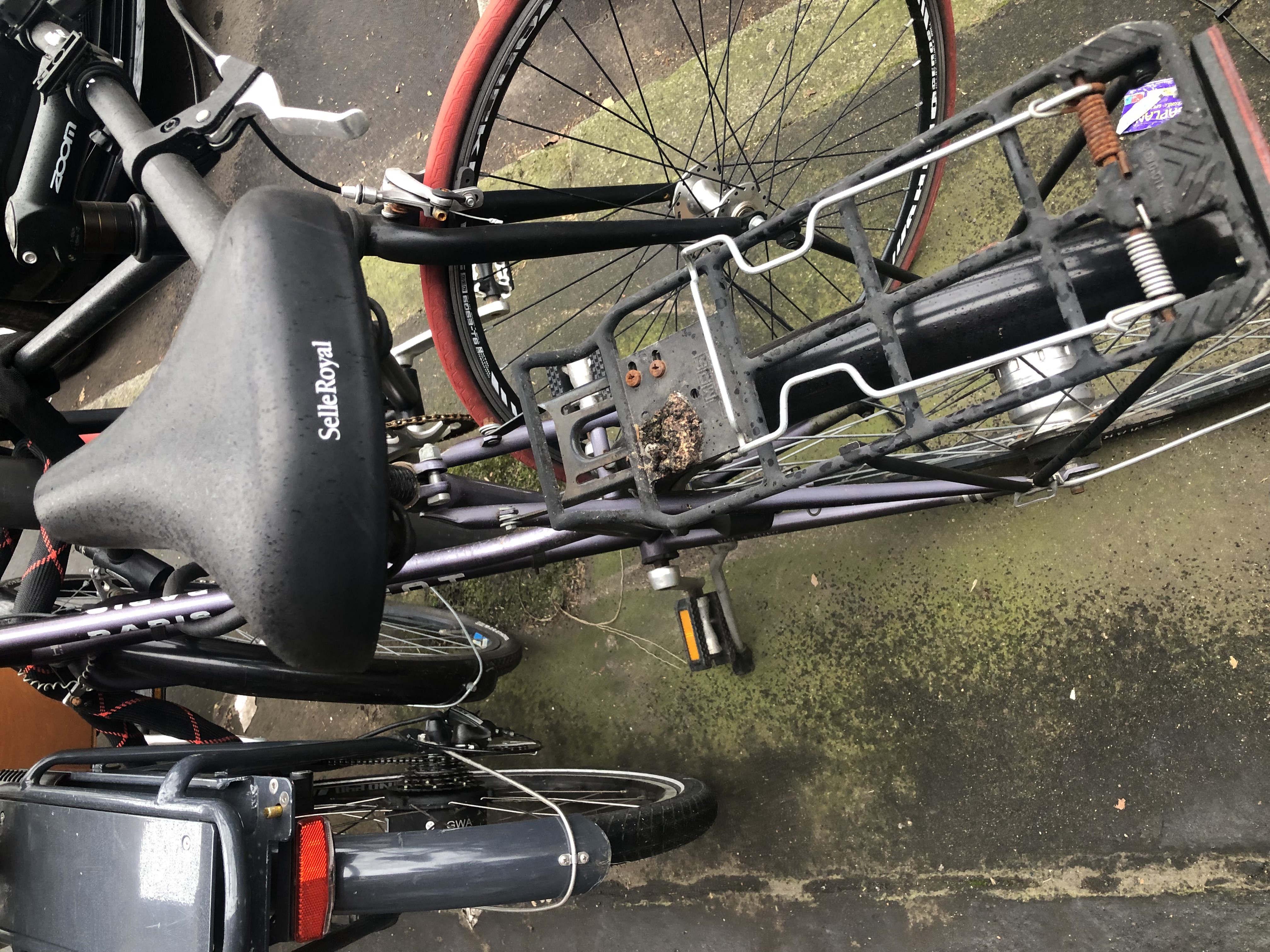 Fahrrad Marke Peugeot steht seit mind. 12 Monaten an Verkehrsschild angeschlossen. Reifen sind platt und Schutzblech lose.