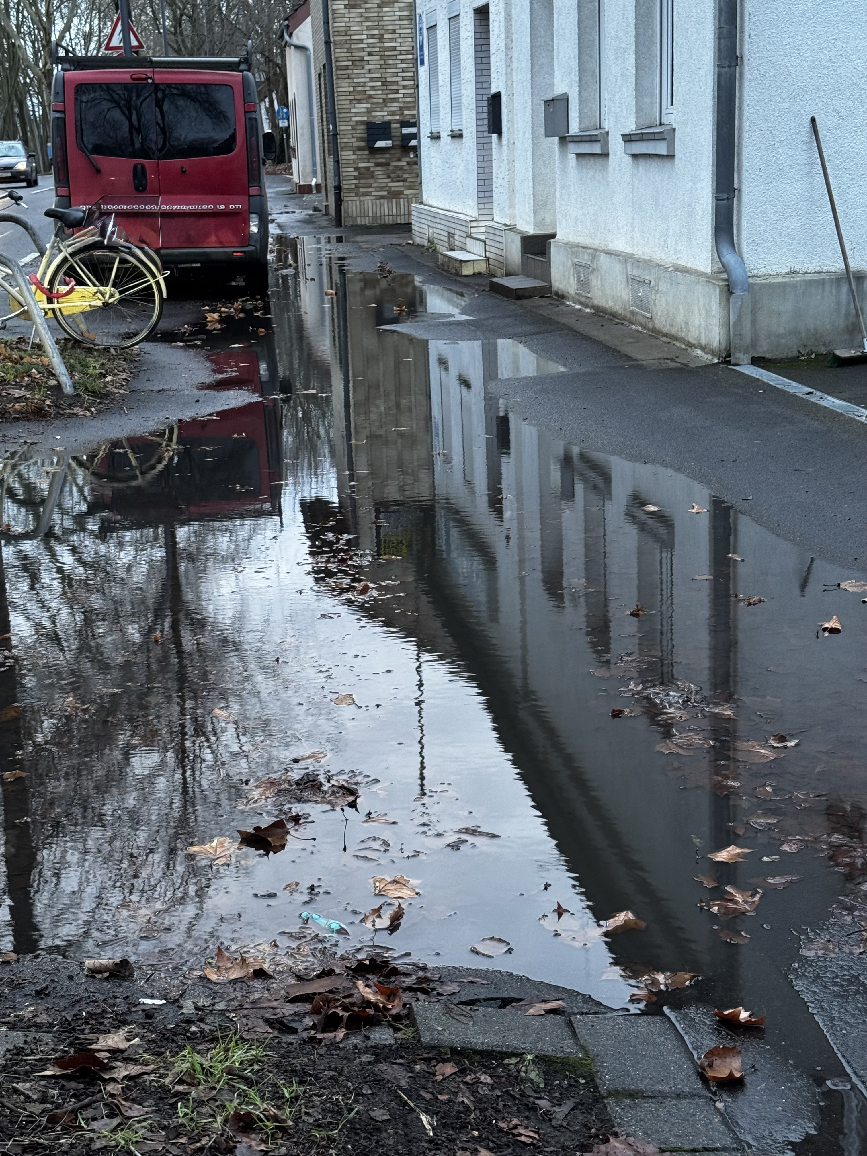 Sehr umfangreiche Pfützenbildung aufgrund fehlender Wassersabführung. Gehobenes Wurzelwerk blockiert den Abfluss des Wassers. Zudem große Unebenheiten auf dem Gehweg mit umfangreichen Pfützenbildung. Das Wasser von der Fahrbahn als auch von Gehweg direkt können nicht abfließen. Erhöhte Unfallgefahr durch Eisbildung auf einer Fläche von geschätzt 30 qm.