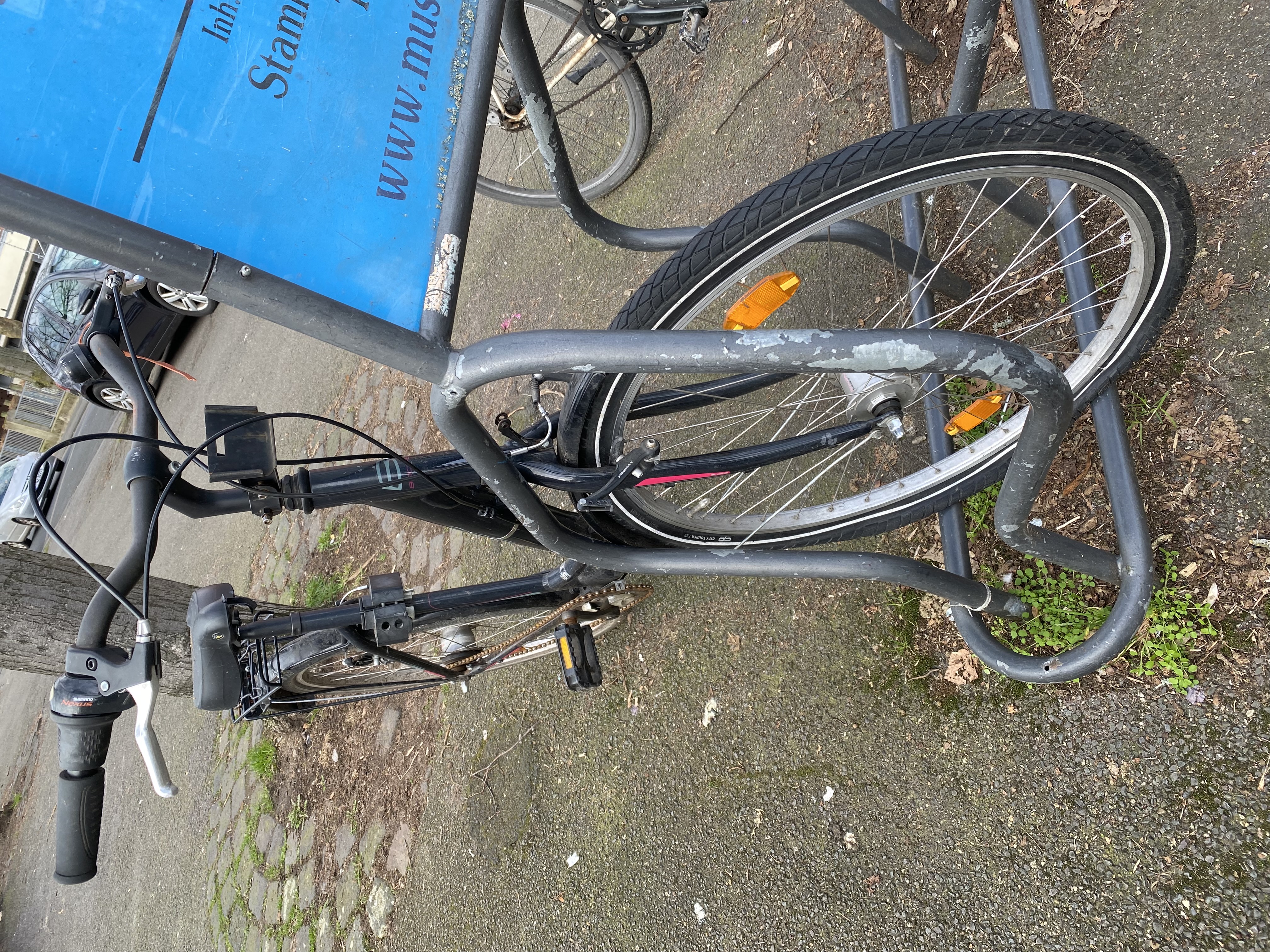 Am Rad ist der Mantel am Vorderrad defekt, ebenfalls die Bremse vorne. Vorne fehlt das Licht, die Kette ist angerostet.