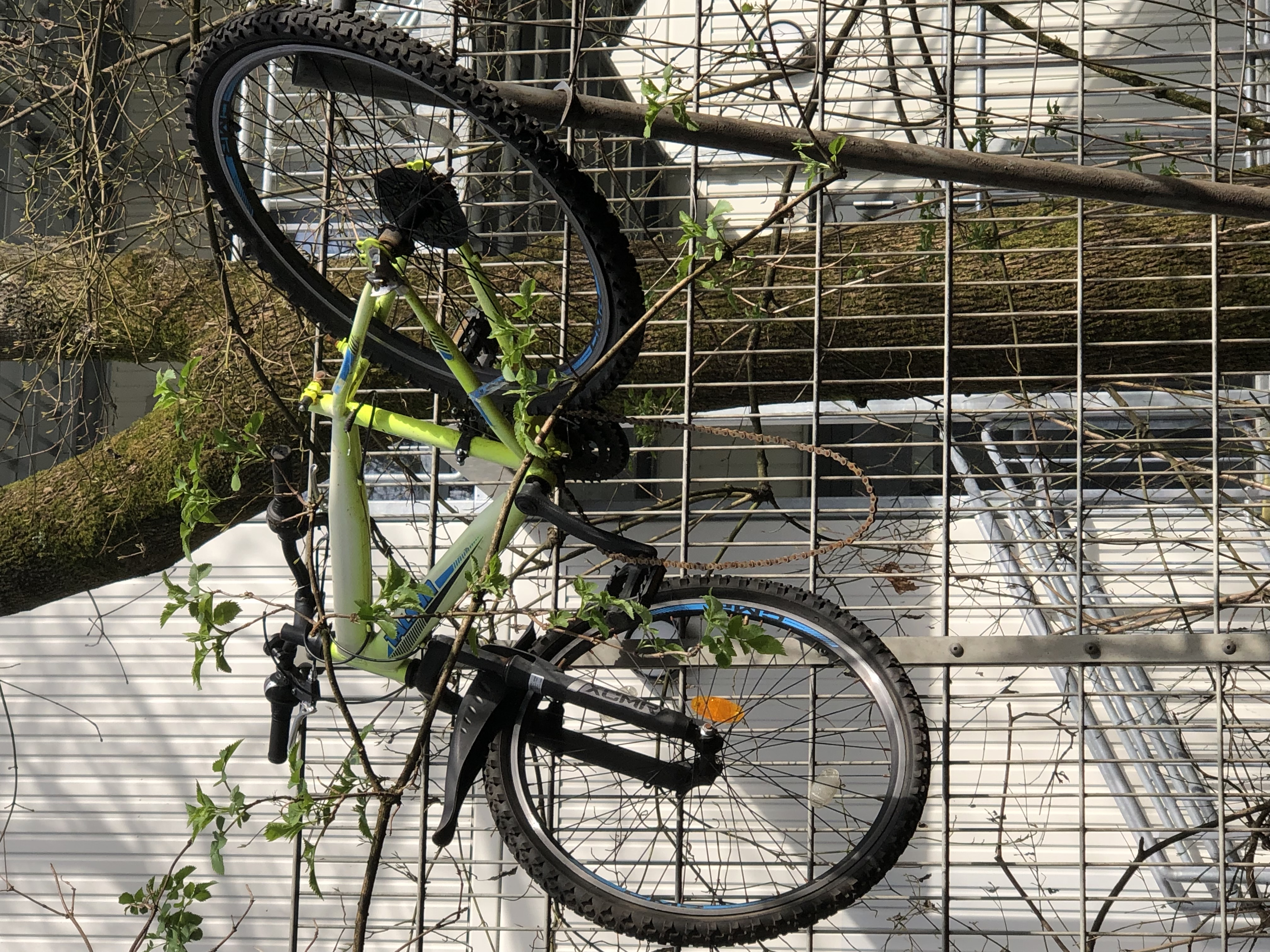 In einem Strach direkt neben dem Weg hängt ein Schrottfahrrad ca. 2 m hoch.