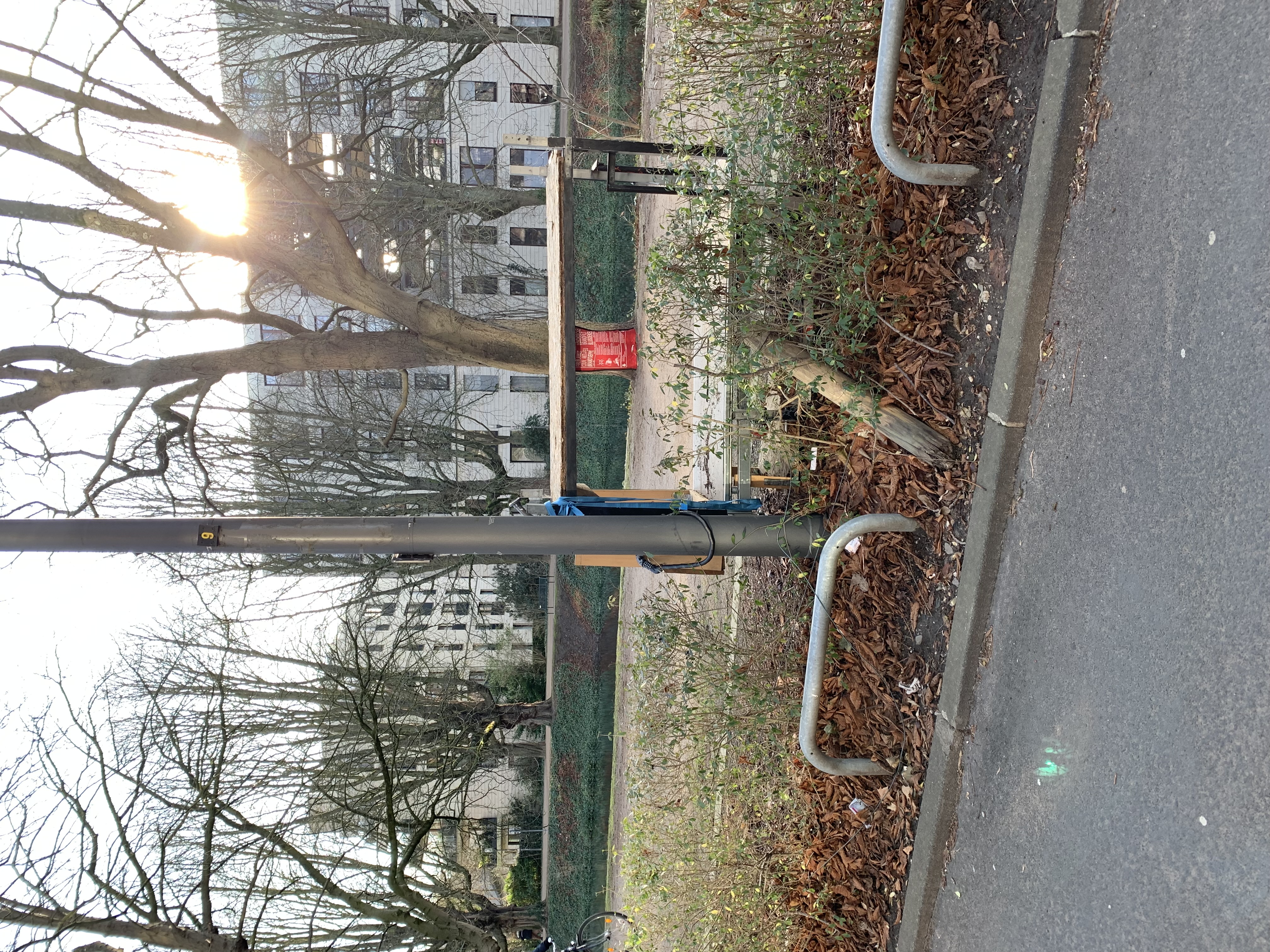 Seit dem 11.11.2023 steht ein vierrädriger Karren auf dem Gehweg am Clarenbachkanal - angekettet an Laterne Nr. 9.