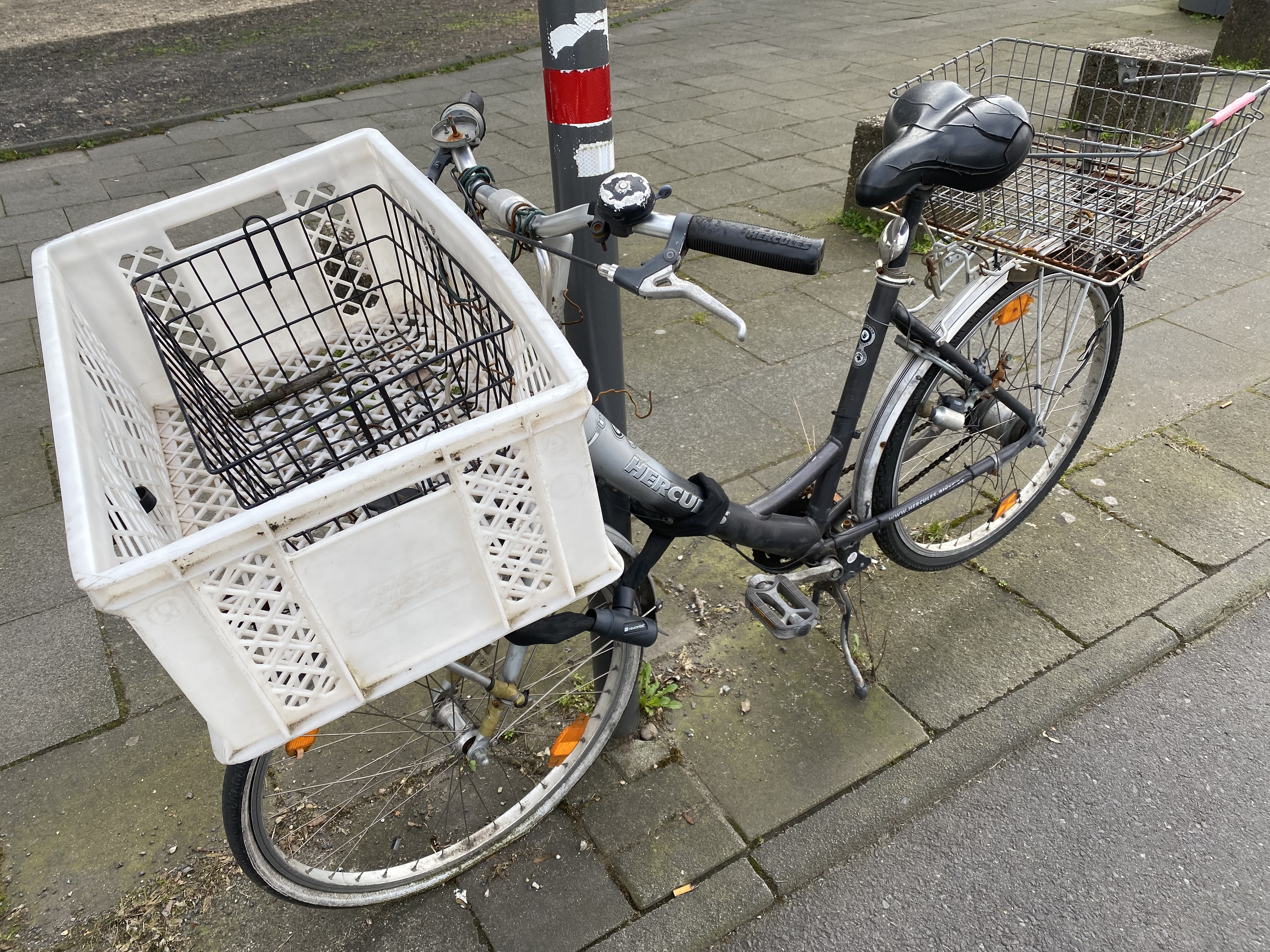 Am Tempo 50 Schild steht das Fahrrad schon seit 2 Wochen (erstmals gesehen). Der Reifen vorne ist platt und schon spröde, der Sattel ziemlich kaputt.