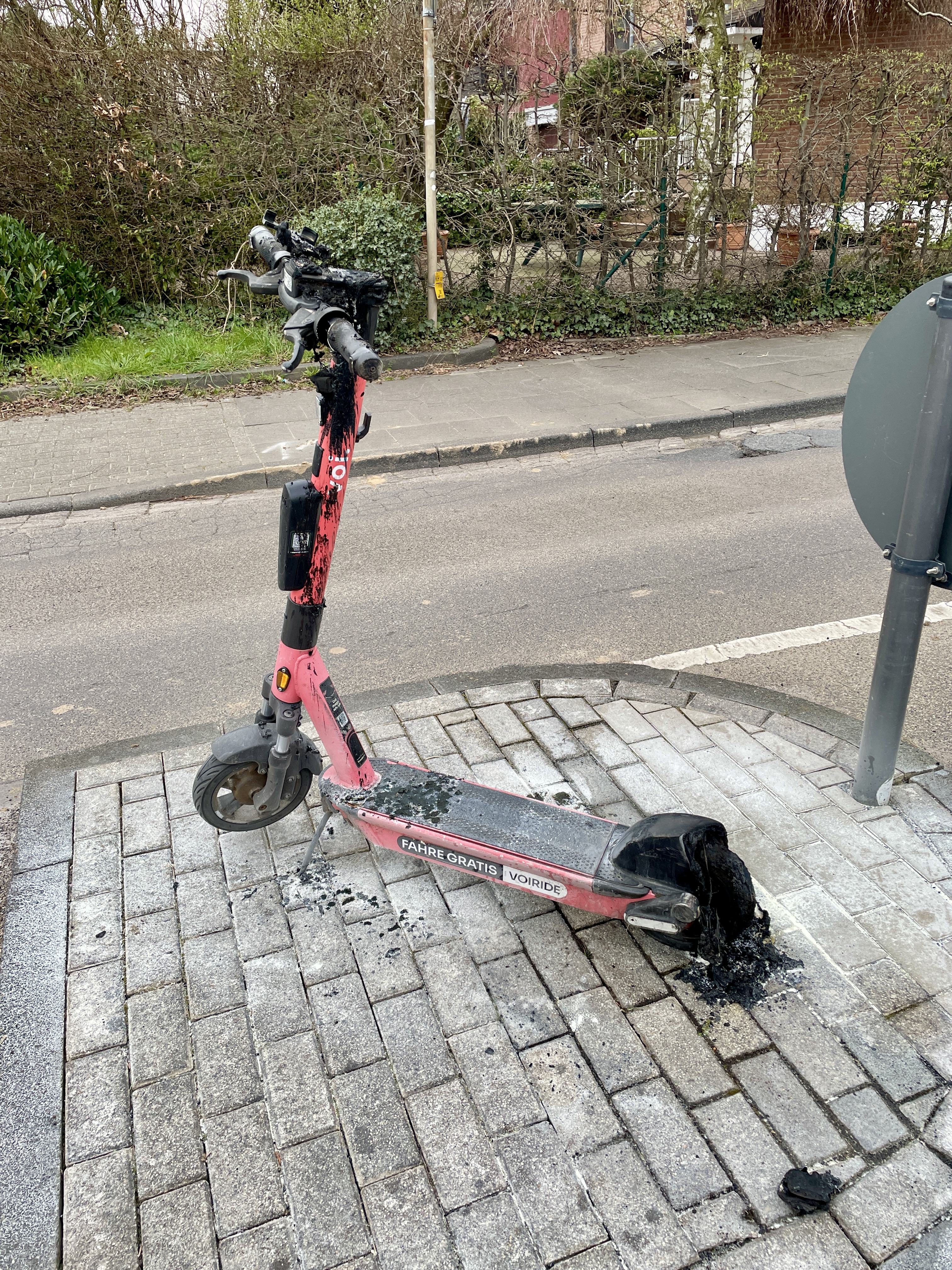 Ein angebrannter e-scooter steht auf der Verkehrsinsel Auf dem Klemberg / Ecke Ritterstr., 50999 Köln-Weiß