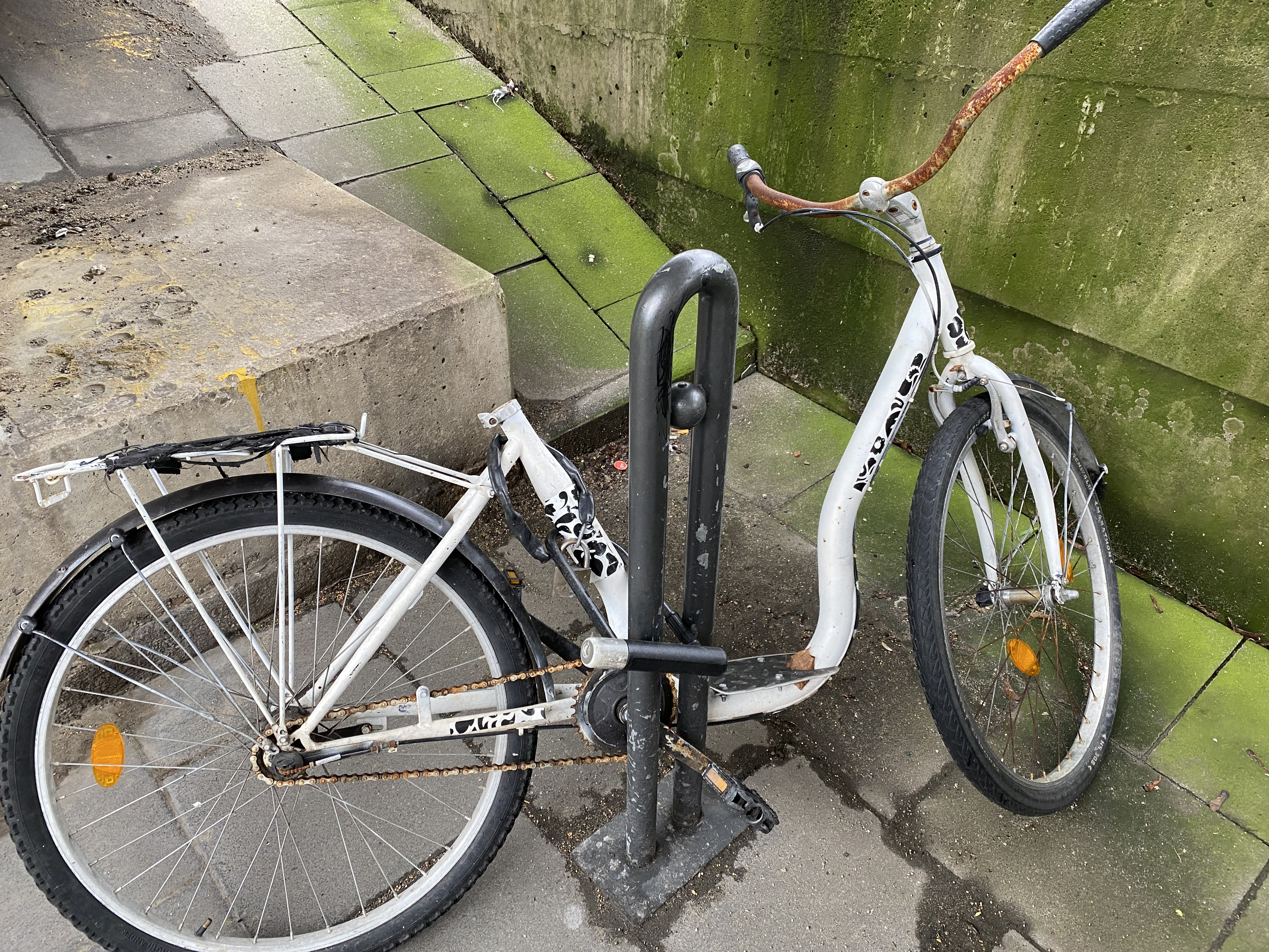 Unter dem Fußgängerüberweg zur Bahnhaltestelle Boltensternstraße steht eine Ansammlung von defekten Fahrrädern.