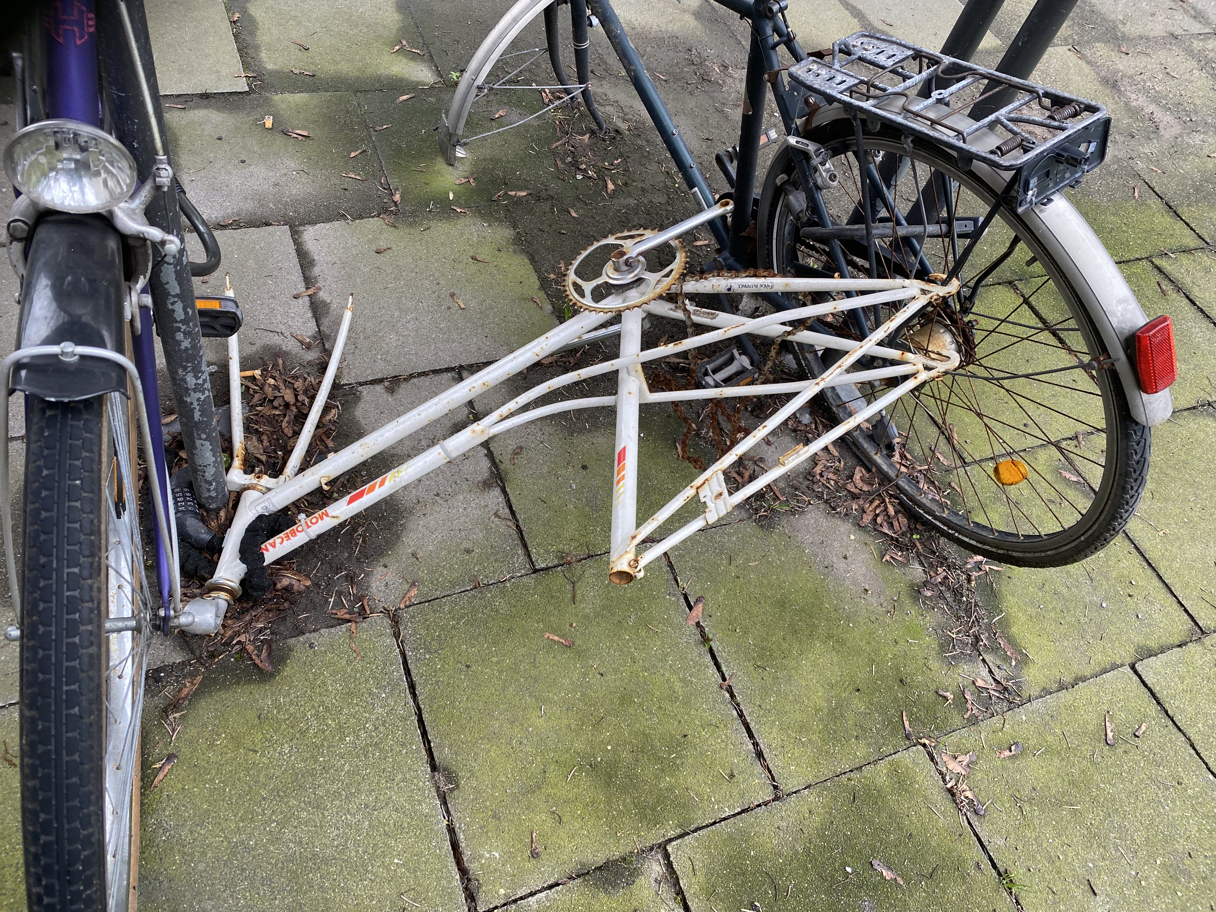 Unter dem Fußgängerüberweg zur Bahnhaltestelle Boltensternstraße steht eine Ansammlung von defekten Fahrrädern.