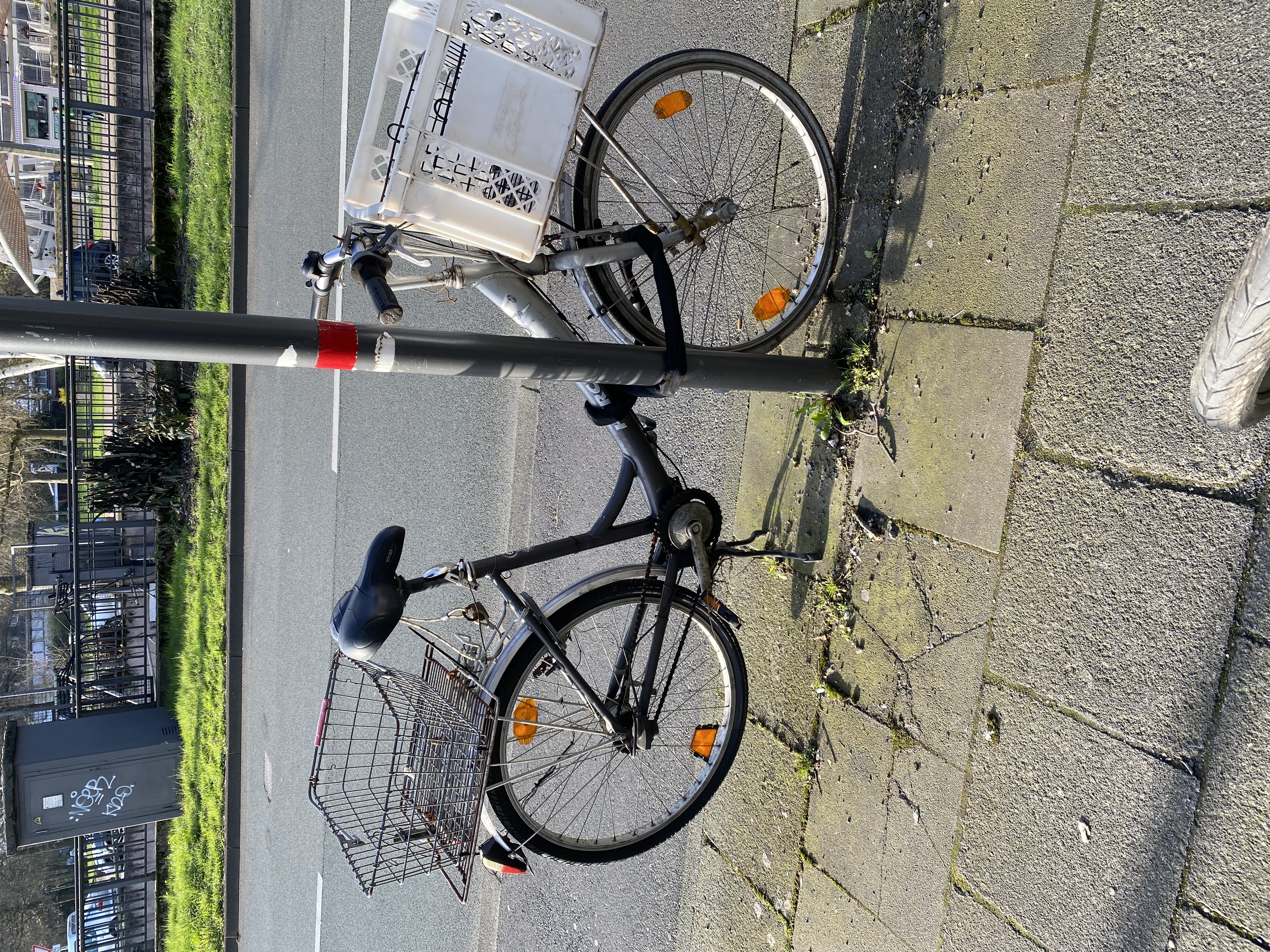 Am Tempo 50 Schild steht das Fahrrad schon seit 2 Wochen (erstmals gesehen). Der Reifen vorne ist platt und schon spröde, der Sattel ziemlich kaputt.