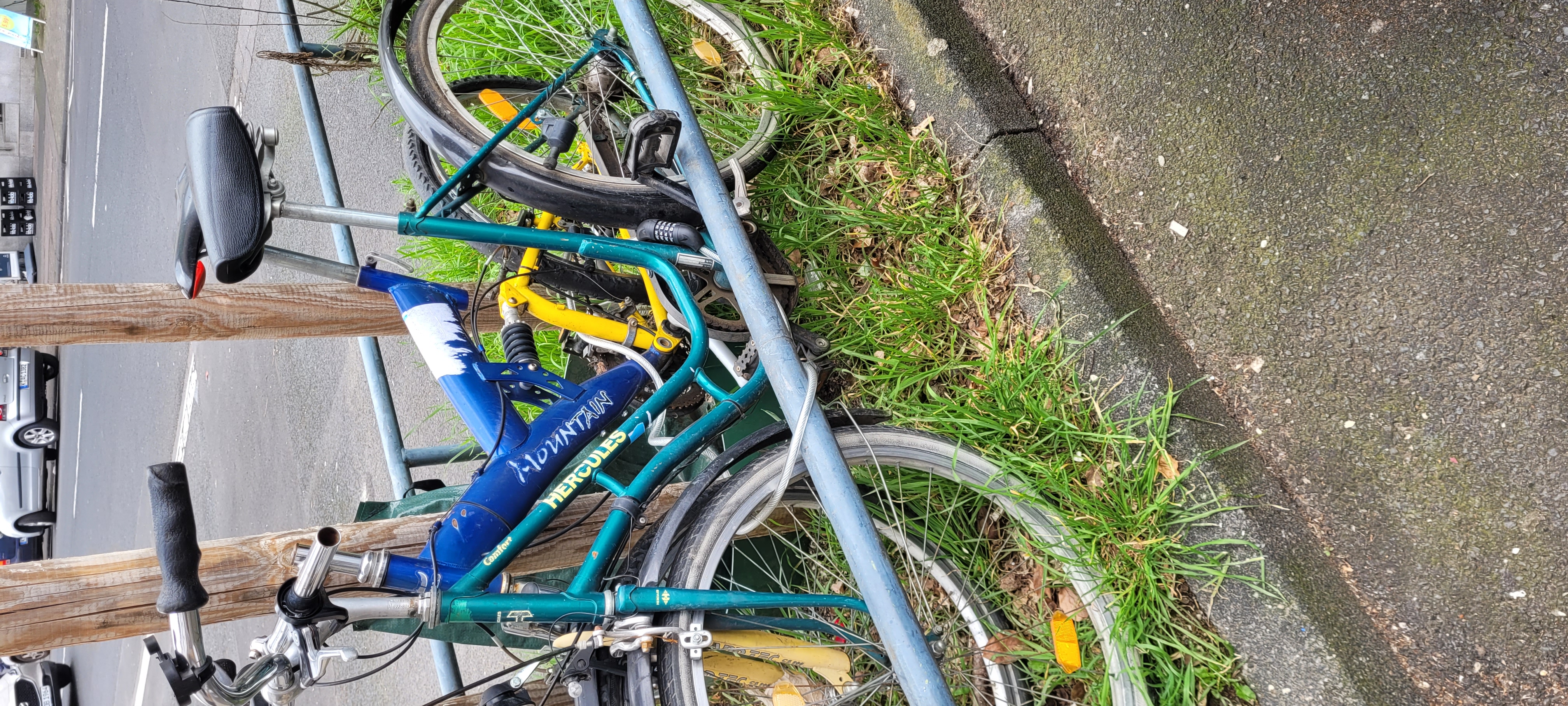 Hier hat jemand 2 Schrottfahrräder in unser Pflanzbeet vor dem Haus gestellt. Wir können das Beet leider nicht pflegen.