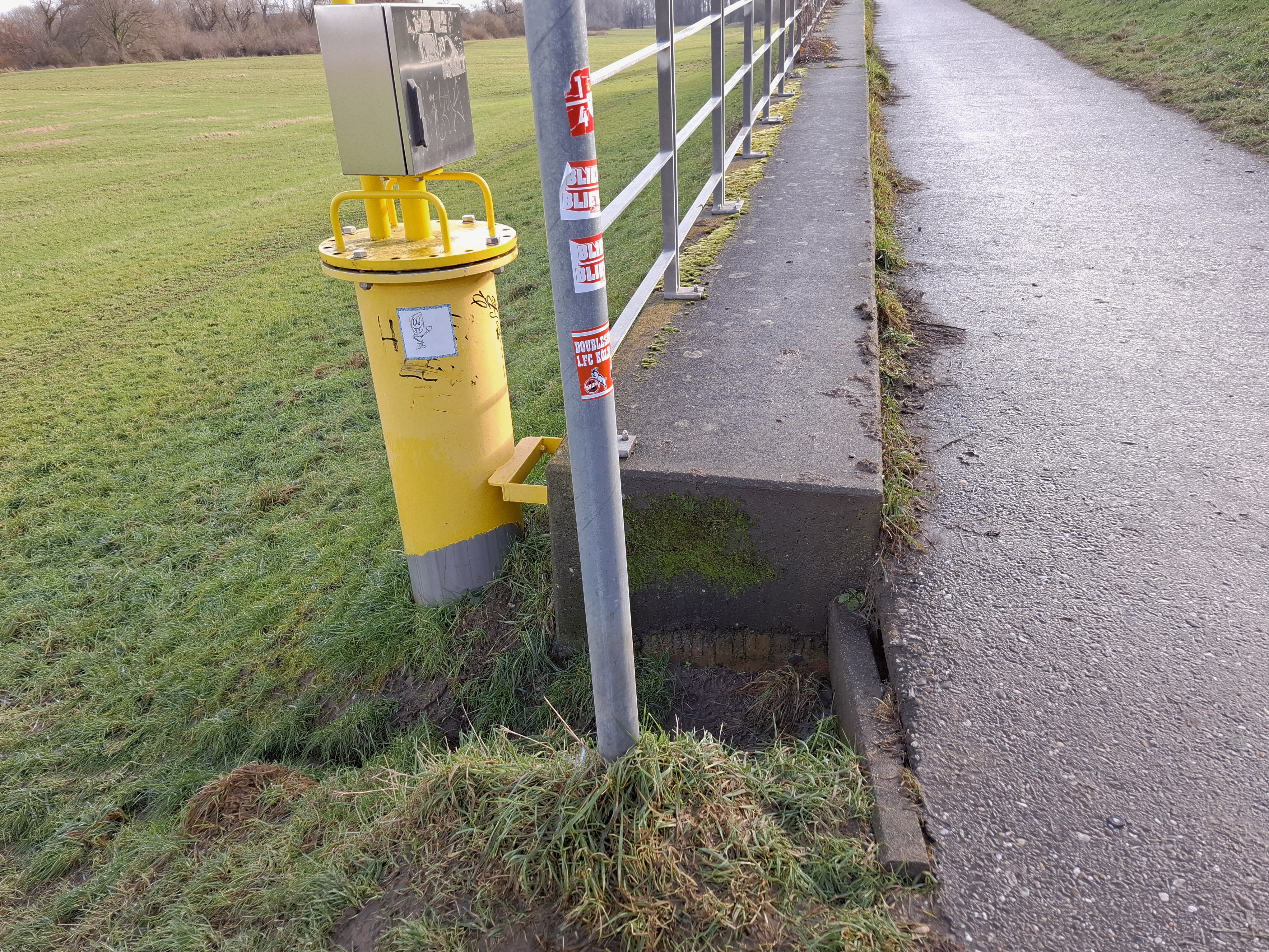 der Rad- und Fußweg an der Hochwasser Schutzmauer vor der Rampe auf den Rhein-Damm ist unterspült und der Randstein abgerutscht.