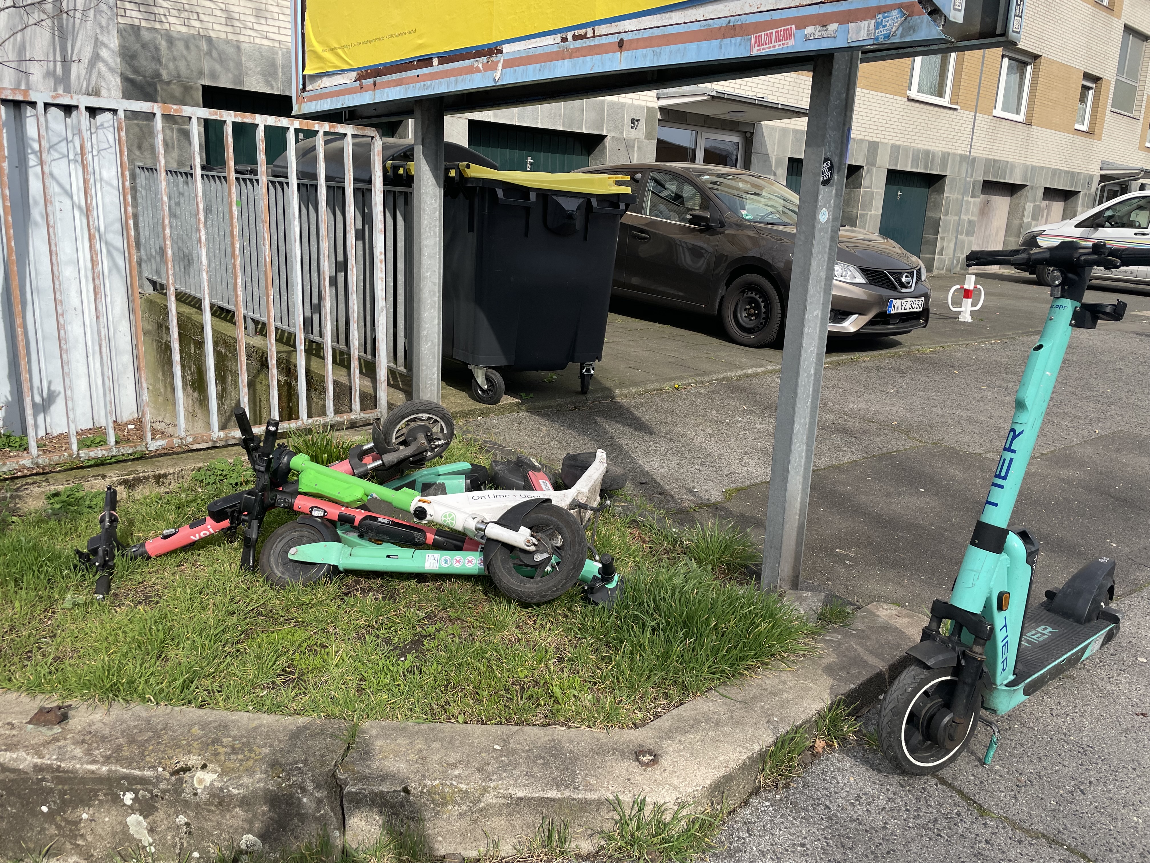 Regelmäßig (jede Woche), liegen hier diese Roller vor unserem Haus. Die Betreiber wurden schon lange und immer wieder informiert, aber es passiert nichts. Der Zustand wird immer schlimmer und bezieht sich auch auf den ganzen Stadtteil Nippes (und darüber hinaus).