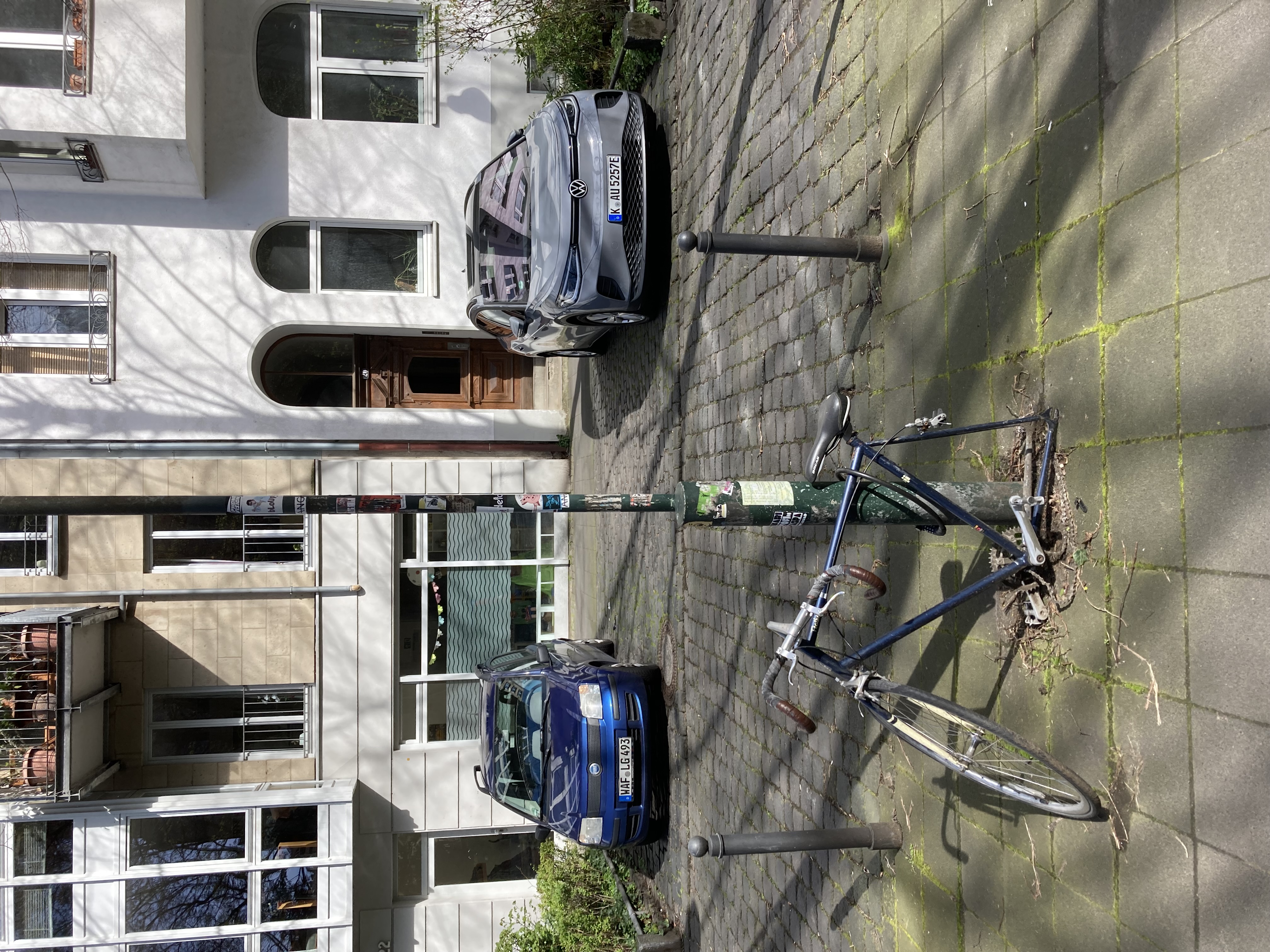 Gegenüber dem Haus Neusser Platz 20 steht angekettet vor der Agneskirche ein Schrott Fahrrad ohne Hinterrad