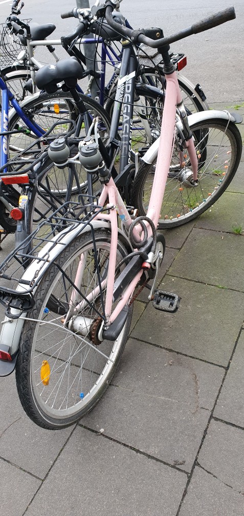Nicht mehr benutztes rosa Schrottrad. Kette am Durchrosten; Lenker beginnt zu rosten, Sattel fehlt.
