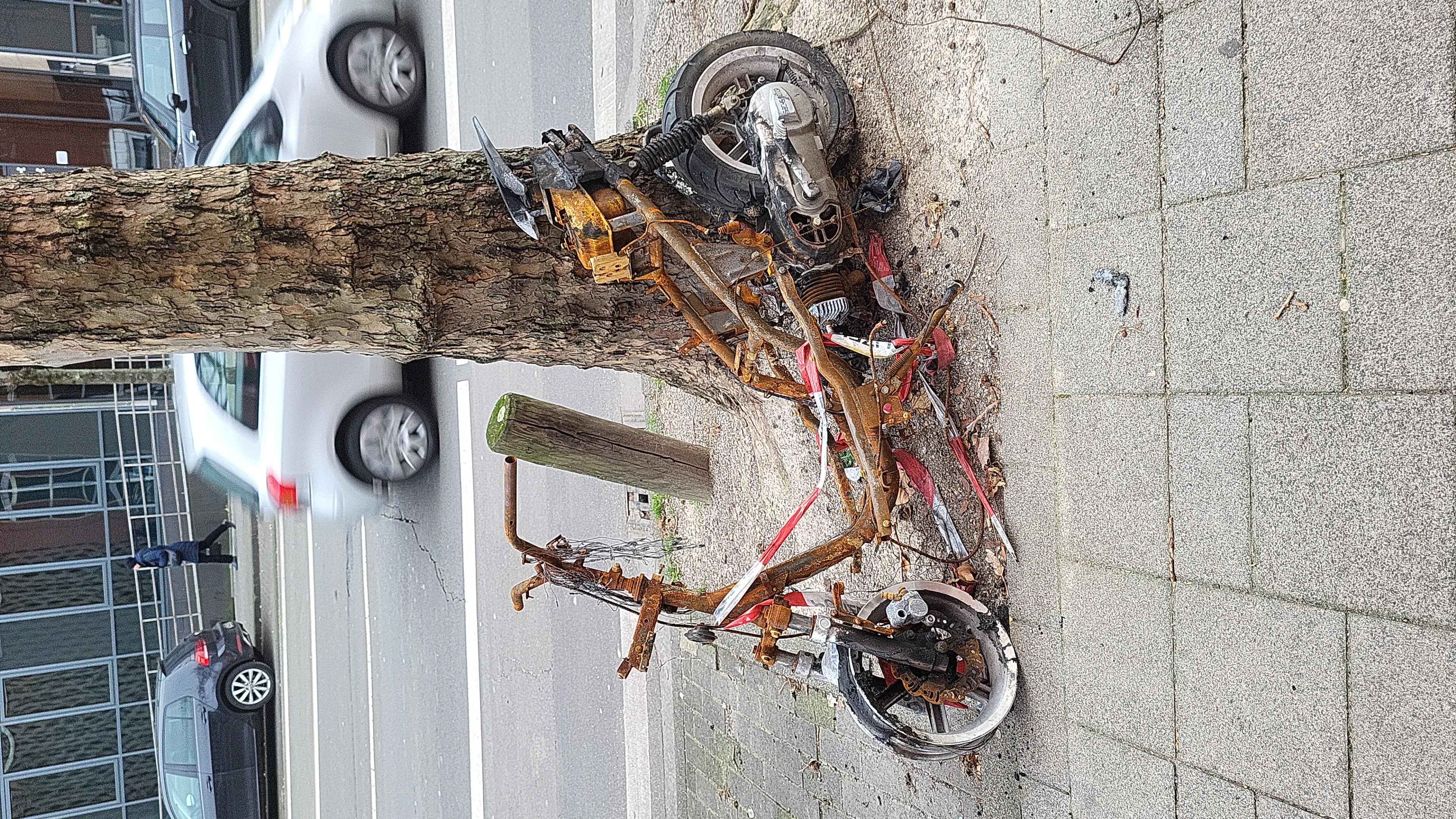am Altkleidersammelcontainer auf der Magnusstr. steht ein ausgebrannten Moped
